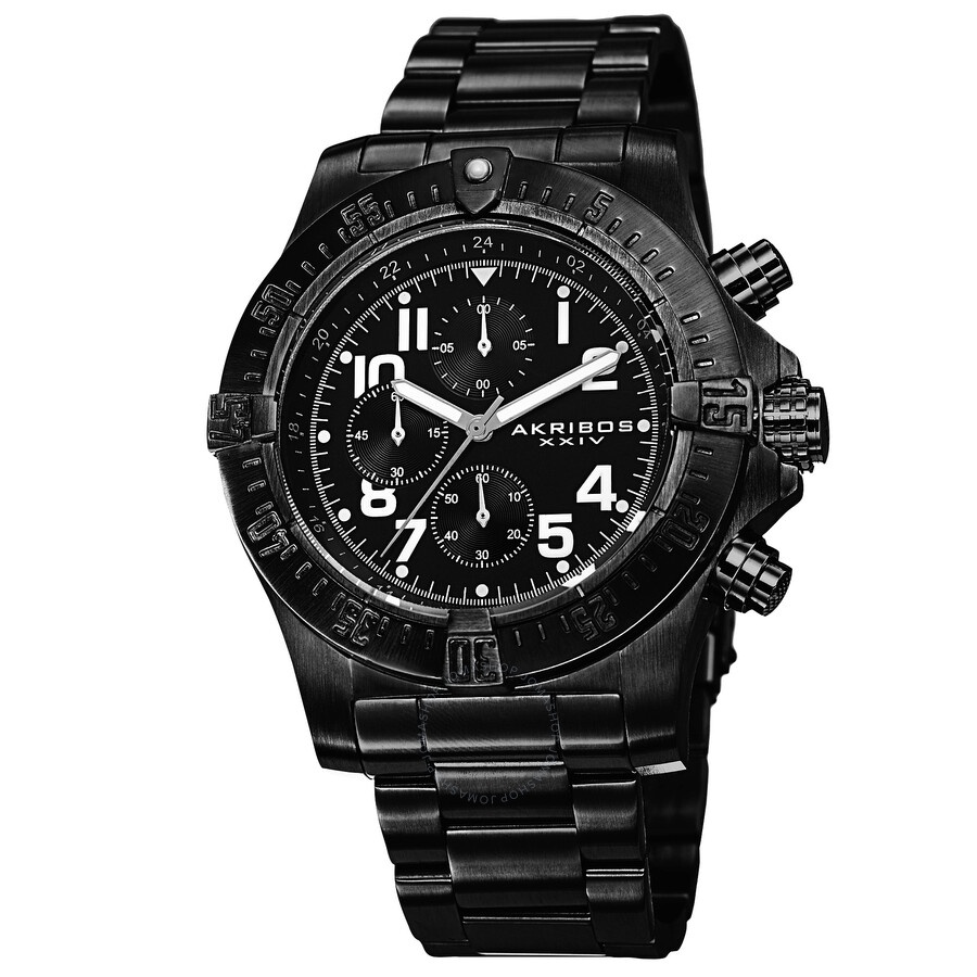 Black ion-plated stainless steel case and bracelet. Fixed black ion-plated bezel. Black matte dial with luminous silver-tone hands and Arabic numeral hour markers. Minute markers. 24 hour markers around the outer rim. Dial Type: Analog. Luminescent hands and hour markers. Chronograph - three sub-dials displaying: 60 second, 60 minute and 1/10th of a second. Quartz movement. Scratch resistant mineral crystal with sapphire coating. Pull / push crown. Screw down case back. Case diameter: 48.5 mm. Case thickness: 16 mm. Round case shape. Band width: 22 mm. Band length: 8.5 inches. Fold over clasp with double push button release. Water resistant at 50 meters / 165 feet. Functions: date, hour, minute, second. Additional Info: suitable for swimming and showering. Casual watch style. Watch label: Hong Kong. Akribos XXIV Chronograph Black Dial Black Ion-plated Stainless Steel Men's Watch AK711BK. INFORMATION Brand: Akribos Xxiv Gender: Mens Model: AK711BK Watch Label: Hong Kong Movement: Quartz CASE Case Size: 48.5 mm Case Thickness: 16 mm Case Material: Stainless Steel Case Shape: Round Case Back: Screw Down BAND Band Material: Stainless Steel Band Type: Bracelet Band Color: Black Ion-plated Band Length: 8.5 inches Band Width: 22 mm Clasp: Fold Over with Double Push Button Release DIAL Dial Color: Black Matte Type: Analog Crystal: Mineral with Sapphire coating Hands: Luminous Silver-tone Dial Markers: Arabic Numeral Second Markers: Minute Markers. 24 hour Markers around the outer rim Sub Dials: Three - 60 Second, 60 Minute and 1/10th of a Second Luminiscence: Hands and Hour Markers Bezel: Fixed Bezel Color: Black Ion-plated Crown: Pull / Push FEATURES Water Resistance: 50 meters / 165 feet Functions: Date, Hour, Minute, Second Watch Features: Chronograph, Stainless Steel, Analog ADDITIONAL INFO Watch Style: Casual Warranty: With Manufacturers Guarantee UPC Code: 848572043175 Additional Info: suitable for swimming and showering Jomashop Sku: AK711BK Department: Watches Category: Watches
