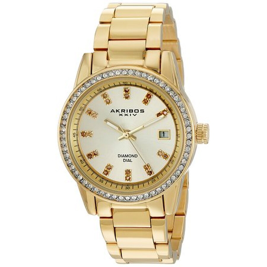 Gold-tone alloy case with a gold-tone stainless steel bracelet. Fixed gold-tone alloy bezel set with Swarovski crystals. Gold dial with luminous fill gold-tone hands and diamond hour markers. Arabic numeral minute markers (at 5 minute intervals). Minute markers around the outer rim. Dial Type: Analog. Luminescent hands. Date display at the 3 o'clock position. Quartz movement. Scratch resistant mineral crystal. Pull / push crown. Solid case back. Round case shape. Case size: 36 mm. Case thickness: 11 mm. Band width: 15 mm. Deployment clasp with a push button release. Water resistant at 30 meters / 100 feet. Functions: date, hour, minute, second. Lumin Series. Casual watch style. Watch label: Japan Movt. Akribos XXIV Lumin Gold Dial Ladies Watch AK928YG. GENERAL Closure Type: Deployment Clasp INFORMATION Brand: Akribos Xxiv Series: Lumin Collection Name: Lumin Gender: Womens Model: AK928YG Watch Label: Japan Movt Movement: Quartz CASE Case Size: 36 mm Case Thickness: 11 mm Case Material: Alloy Case Shape: Round Case Back: Solid BAND Band Material: Stainless Steel Band Type: Bracelet Band Color: Gold-tone Band Width: 15 mm Clasp: Deployment with Push Button Release DIAL Dial Color: Gold Type: Analog Crystal: Scratch Resistant Mineral Hands: Luminous Fill Gold-tone Dial Markers: Diamond Second Markers: Arabic Numeral Minute Markers (at 5 minute intervals). Minute Markers around the outer rim Luminiscence: Hands Bezel: Fixed Bezel Color: Gold-tone Bezel Material: Alloy set with Swarovski Crystals Crown: Pull / Push FEATURES Water Resistance: 30 meters / 100 feet Calendar: Date display at the 3 o'clock position Functions: Date, Hour, Minute, Second Watch Features: Diamond, Stainless Steel, Gold, Analog ADDITIONAL INFO Watch Style: Casual Warranty: With Manufacturers Guarantee UPC Code: 848572093651 Jomashop Sku: AK928YG Department: Watches Category: Watches