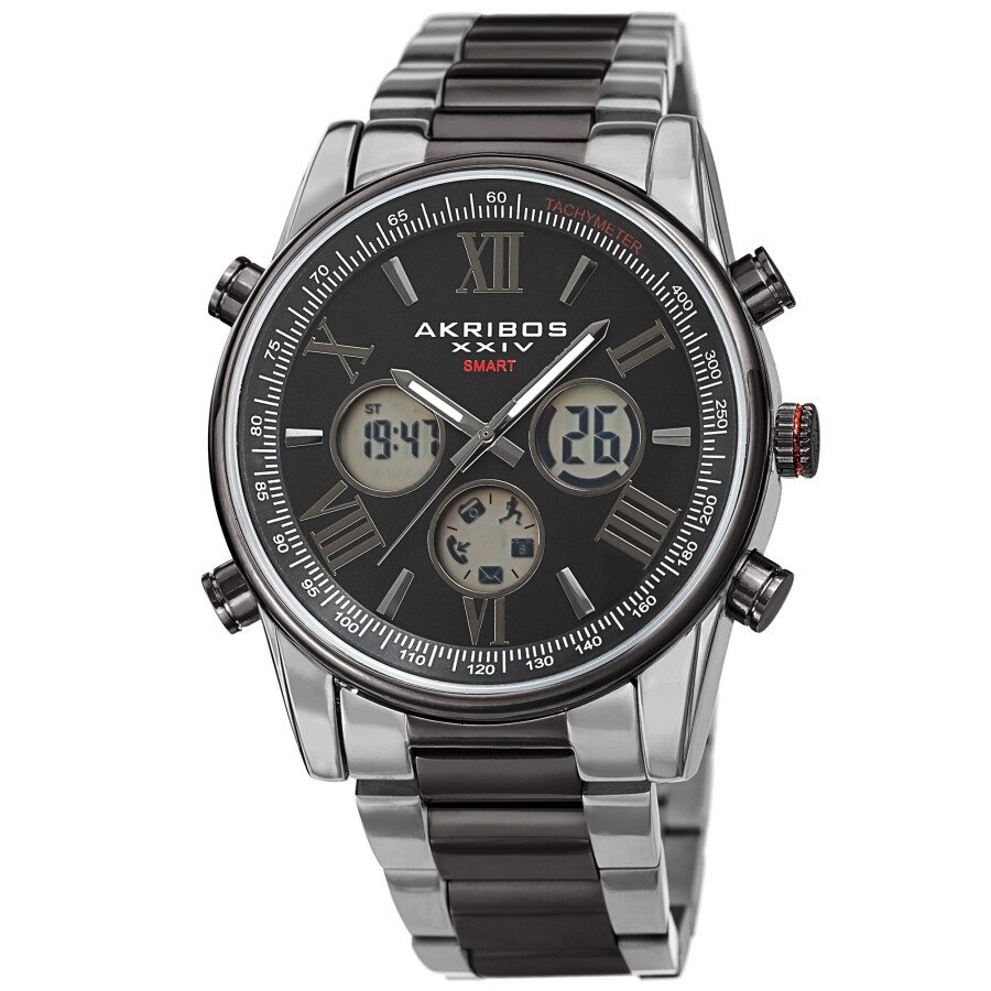 Silver-tone composite metal case with a tow-tone (silver-tone and black) stainless steel bracelet. Fixed black composite metal bezel. Black dial with luminous silver-tone hands and alternaring Roman numeral and index hour markers. Minute markers. Tachymeter markings around the outer rim. Dial Type: Analog-digital. Luminescent hands and markers. Three digital sub-dials displaying: seconds, time and function. Quartz movement. Scratch resistant Hardlex crystal. Pull / push crown. Solid case back. Round case shape. Case size: 45 mm. Case thickness: 14.5 mm. Band width: 24 mm, band length: 8.5 inches. Hidden fold over clasp. Water resistant at 30 meters / 100 feet. Functions: date, hour, minute, second, tachymeter. Sport watch style. Akribos XXIV Quartz Black Dial Men's Watch AK1095TTB. INFORMATION Brand: Akribos Xxiv Gender: Mens Model: AK1095TTB Movement: Quartz CASE Case Size: 45 mm Case Thickness: 14.5 mm Case Material: Composite Metal Case Shape: Round Case Back: Solid BAND Band Material: Stainless Steel Band Type: Bracelet Band Color: Tow-tone (Silver-tone and Black) Band Length: 8.5 inches Band Width: 24 mm Clasp: Hidden Fold Over DIAL Dial Color: Black Type: Analog-Digital Crystal: Scratch Resistant Hardlex Hands: Luminous Silver-tone Dial Markers: Alternaring Roman Numeral and Index Second Markers: Minute Markers. Tachymeter Markings around the outer rim Sub Dials: Three Digital - Seconds, Time and Function Luminiscence: Hands and Markers Bezel: Fixed Bezel Color: Black Bezel Material: Composite Metal Crown: Pull / Push FEATURES Water Resistance: 30 meters / 100 feet Functions: Date, Hour, Minute, Second, Tachymeter Watch Features: Stainless Steel, Analog, Digital ADDITIONAL INFO Watch Style: Smart Warranty: With Manufacturers Guarantee Jomashop Sku: AK1095TTB Department: Watches Category: Smart Watch