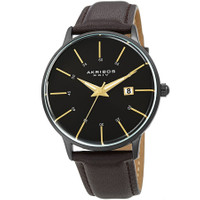 Black-plated composite metal case with a multi-color leather strap. Fixed black-plated composite metal bezel. Black dial with luminous gold-tone dauphine-style hands and index hour markers. Arabic numeral minute markers (at 5 minute intervals). Dial Type: Analog. Luminescent hands. Date display at the 3 o'clock position. Quartz movement. Scratch resistant Hardlex crystal. Pull / push crown. Solid case back. Round case shape. Case size: 40 mm. Case thickness: 10 mm. Band width: 20 mm. Tang clasp. Water resistant at 30 meters / 100 feet. Functions: date, hour, minute, second. Casual watch style. Akribos XXIV Quartz Black Dial Men's Watch AK1104BK-S. INFORMATION Brand: Akribos Xxiv Gender: Mens Model: AK1104BK-S Movement: Quartz CASE Case Size: 40 mm Case Thickness: 10 mm Case Material: Composite Metal Case Shape: Round Case Back: Solid BAND Band Material: Leather Band Type: Strap Band Color: Multi-Color Band Width: 20 mm Clasp: Tang DIAL Dial Color: Black Type: Analog Crystal: Scratch Resistant Hardlex Hands: Luminous Gold-tone Dauphine-style Dial Markers: Index Second Markers: Arabic Numeral Minute Markers (at 5 minute intervals) Luminiscence: Hands Bezel: Fixed Bezel Color: Black-plated Bezel Material: Composite Metal Crown: Pull / Push FEATURES Water Resistance: 30 meters / 100 feet Calendar: Date display at the 3 o'clock position Functions: Date, Hour, Minute, Second Watch Features: Leather, Gold, Analog ADDITIONAL INFO Watch Style: Casual Warranty: With Manufacturers Guarantee UPC Code: 842106159165 Jomashop Sku: AK1104BKS Department: Watches Category: Watches