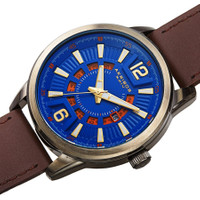 Gunmetal-plated stainless steel case with a brown leather strap. Fixed gunmetal-plated bezel. Blue dial with luminous gold-tone hands and index hour markers. Arabic numerals appear the 6 and 12 o'clock positions. Arabic numeral minute markers (at 5 minute intervals). Minute markers around the outer rim. Dial Type: Analog. Luminescent hands and markers. Date display at the 3 o'clock position. Quartz movement. Scratch resistant mineral crystal. Pull / push crown. Solid case back. Round case shape. Case size: 45 mm. Case thickness: 11 mm. Band width: 22 mm, band length: 8.5 inches. Tang clasp. Water resistant at 30 meters / 100 feet. Functions: date, hour, minute, second. Fashion watch style. Akribos XXIV Quartz Blue Dial Men's Watch AK1079BUBR. INFORMATION Brand: Akribos Xxiv Gender: Mens Model: AK1079BUBR Movement: Quartz CASE Case Size: 45 mm Case Thickness: 11 mm Case Material: Stainless Steel Case Shape: Round Case Back: Solid BAND Band Material: Leather Band Type: Strap Band Color: Brown Band Length: 8.5 inches Band Width: 22 mm Clasp: Tang DIAL Dial Color: Blue Type: Analog Crystal: Scratch Resistant Mineral Hands: Luminous Gold-tone Dial Markers: Index Second Markers: Arabic Numerals appear the 6 and 12 o'clock positions. Minute Markers around the outer rim Luminiscence: Hands and Markers Bezel: Fixed Bezel Color: Gunmetal-plated Bezel Material: Stainless Steel Crown: Pull / Push FEATURES Water Resistance: 30 meters / 100 feet Calendar: Date display at the 3 o'clock position Functions: Date, Hour, Minute, Second Watch Features: Stainless Steel, Leather, Gold, Analog ADDITIONAL INFO Watch Style: Fashion Warranty: With Manufacturers Guarantee UPC Code: 842106144840 Jomashop Sku: AKAK1079BUBR Department: Watches Category: Watches