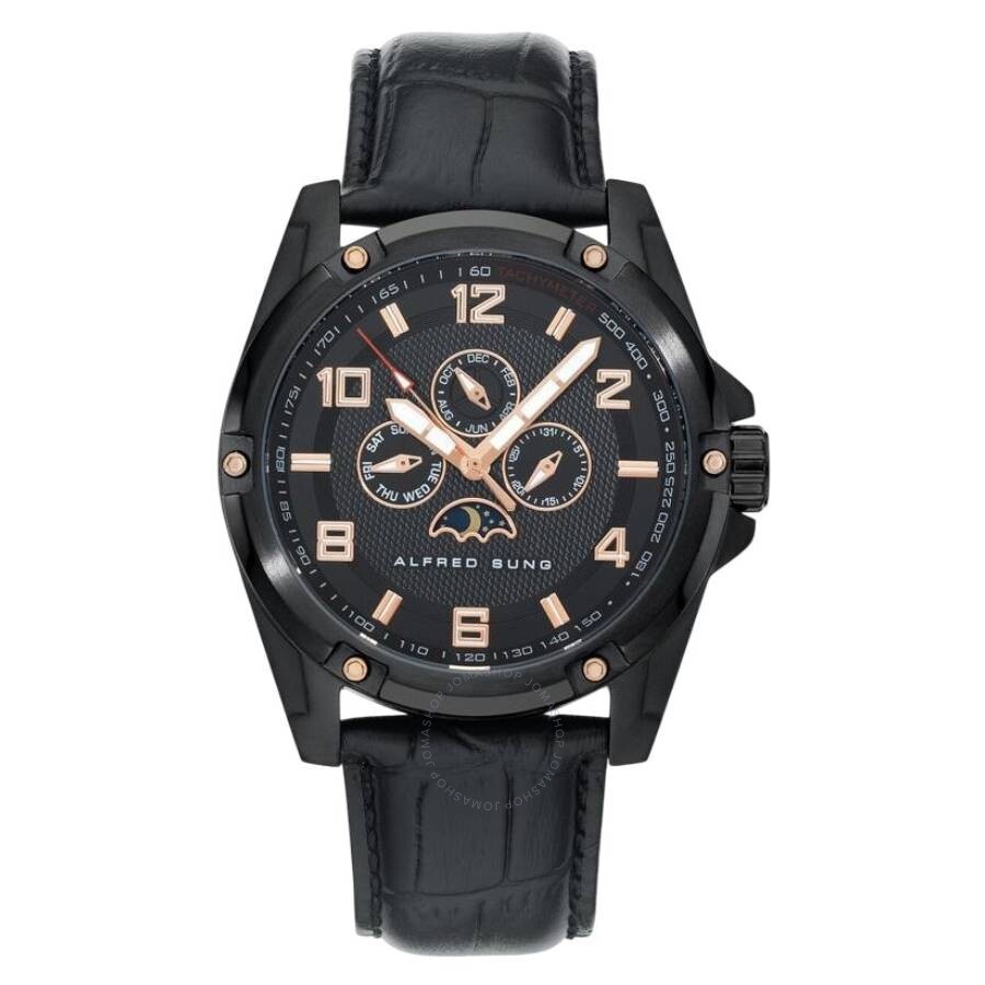 Black stainless steel case with a black leather strap. Fixed black stainless steel bezel. Black dial with rose gold-tone hands and index-Arabic numeral hour markers. Tachymeter markers around the outer rim. Dial Type: Analog. Four sub-dials displaying: date, day month and moon phase. Quartz movement. Scratch resistant mineral crystal. Pull / push crown. Solid case back. Round case shape, case size: 46 mm. Buckle clasp. Water resistant at 100 meters / 330 feet. Functions: month, date, day, hour, minute, second, moon phase. Astral Series. Casual watch style. Watch label: Japan Movt. Alfred Sung Astral Quartz Moon Phase Black Dial Men's Watch AS1900BL-1A. CASE Case Size: 46 Case Material: Stainless Steel Case Shape: Round Case Back: Solid BAND Band Material: Leather Band Type: Strap Band Color: Black Clasp: Buckle DIAL Dial Color: Black Type: Analog Crystal: Scratch Resistant Mineral Hands: Rose Gold-tone Dial Markers: Index-Arabic Numeral Second Markers: Tachymeter Markers around the outer rim Sub Dials: Four - Date, Day Month and Moon Phase Bezel: Fixed Bezel Color: Black Bezel Material: Stainless Steel Crown: Pull / Push INFORMATION Brand: Alfred Sung Series: Astral Collection Name: Astral Gender: Mens Model: AS1900BL-1A Watch Label: Japan Movt Movement: Quartz FEATURES Water Resistance: 100 meters / 330 feet Functions: Month, Date, Day, Hour, Minute, Second, Moon Phase Watch Features: Moon Phase, Stainless Steel, Leather, Gold, Analog, Month ADDITIONAL INFO Watch Style: Casual UPC Code: 012098188461 Jomashop Sku: Z-JJM8X Department: Watches