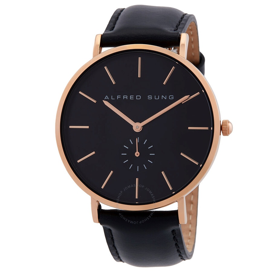 Gold-tone brass case with a black leather strap. Fixed gold-tone brass bezel. Black dial with gold-tone hands and index hour markers. Dial Type: Analog. One subdial displaying: small second. Quartz movement. Pull / push crown. Solid case back. Round case shape, case size: 41 mm. Band width: 18 mm. Buckle clasp. Water resistant at 30 meters / 100 feet. Functions: hour, minute, small second. Ultra Slim Series. Casual watch style. Watch label: Japan Movt. Alfred Sung Ultra Slim Quartz Black Dial Men's Watch AS7100RL-1A. CASE Case Size: 41 Case Material: Brass Case Shape: Round Case Back: Solid BAND Band Material: Leather Band Type: Strap Band Color: Black Band Width: 18 mm Clasp: Buckle DIAL Dial Color: Black Type: Analog Hands: Gold-tone Dial Markers: Index Sub Dials: One - Small Second Bezel: Fixed Bezel Color: Gold-tone Bezel Material: Brass Crown: Pull / Push INFORMATION Brand: Alfred Sung Series: Ultra Slim Collection Name: Ultra Slim Gender: Mens Model: AS7100RL-1A Watch Label: Japan Movt Movement: Quartz FEATURES Water Resistance: 30 meters / 100 feet Functions: Hour, Minute, Small Second Watch Features: Leather, Gold, Analog ADDITIONAL INFO Watch Style: Casual UPC Code: 811238031663 Jomashop Sku: Z-J472J Department: Watches