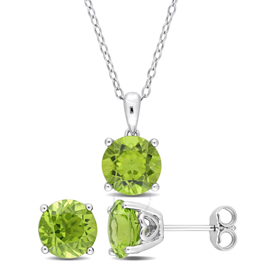Glam up effortlessly with this colorful solitaire pendant with chain and stud earrings set. Crafted in lustrous sterling silver, this timeless two-piece set features three round-cut, 4 prong-set, peridot (8x8mm) gemstones in a classic heart design detail on earrings and a pendant setting. Enhanced with a polished finish, the exquisite pendant is suspended on an 18-inch round cable chain secured with a spring-ring clasp, and the matching solitaire earrings are secured with butterfly closures. Classy jewelry set for dressy occasions GENERAL Stone Shape: Round Color: White INFORMATION Brand: Amour Gender: Womens Model: JMS011256 DETAILS Necklaces: Fashion Chain Type: Cable Closure Type: Spring Ring Material : Sterling Silver Metal Stamp: 925-Sterling Metal Weight: 3.37 Stone Type: Peridot Stone Weight: 2 Stone Color: Green Stone Cut: Round Stone Origin: Natural Total Stones: 3 ADDITIONAL INFO Jomashop Sku: AMR-JMS011256 Department: Jewelry Category: Set Choose a Size: 18 Inches