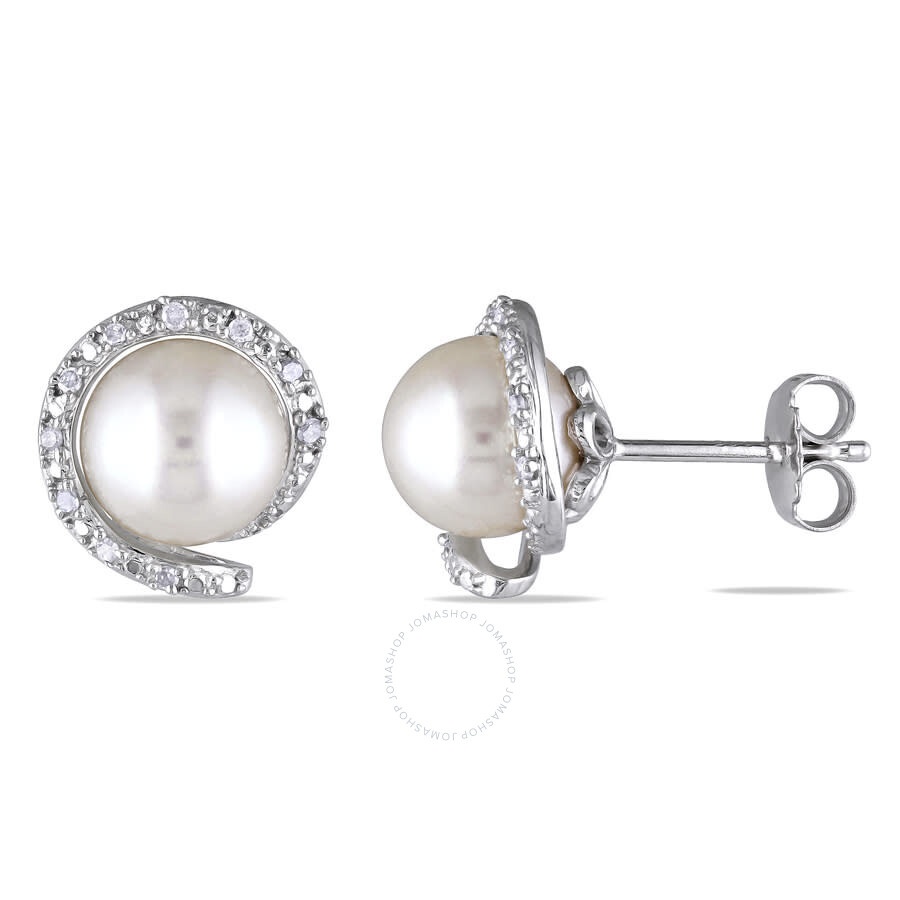 AMOUR 8 - 8.5 Mm White Cultured Freshwater Pearl and 1/10 CT TW Diamond Earrings In Sterling Silver