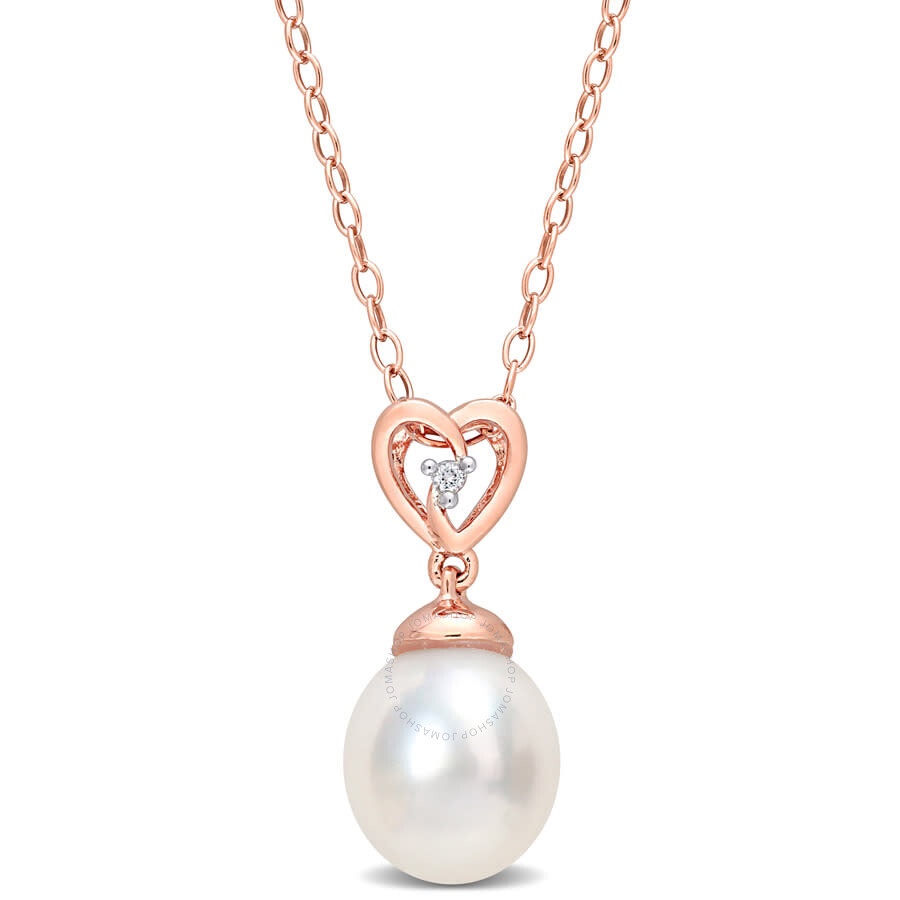 Be the queen of elegance with this sumptuous Open Heart Drop Pendant with Chain. Crafted in luminous rose gold flash plated sterling silver, this classic pendant features a drop-shaped South sea cultured freshwater pearl (8-9mm) and a round-cut, prong-set white topaz gemstone (1.3X1.3Mm) placed above the pearl in an open heart design. Polished to brilliance, this exquisite pendant is suspended on an 18-inch round cable chain and secured with a spring ring clasp. A versatile accessory that will compliment every attire. GENERAL Color: Pink INFORMATION Brand: Amour Gender: Womens Model: JMS009644 DETAILS Necklaces: Pendant Chain Type: Cable Closure Type: Spring Ring Material : Sterling Silver Metal Stamp: 925-Sterling Stone Type: Pearl Stone Color: White Total Stones: 2 ADDITIONAL INFO Additional Info: Pearl Shape: Drop Jomashop Sku: AMR-JMS009644 Department: Jewelry Category: Necklaces Choose a Size: 18 Inches