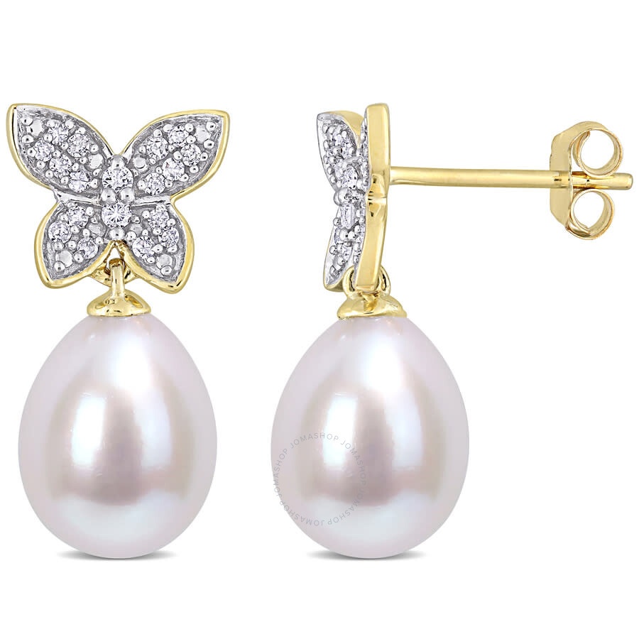 These gorgeous cluster butterfly dangle earrings are crafted in lustrous 10-karat yellow gold. Each of these lovely drop earrings feature a rice cultured freshwater pearl crowned by round-cut, pave-set white diamonds clustered together to form a butterfly. Enhanced with a high polish finish, these butterfly earrings are the perfect gift for your beloved. Pair these fabulous earrings with any casual or business attire for a smart and stylish look. GENERAL Stone Shape: Drop & Rice Color: Yellow INFORMATION Brand: Amour Gender: Womens Model: JMS007173 DETAILS Earrings: Drop/Dangle Material : Yellow Gold Metal Stamp: 10K Metal Weight: 1.23 Stone Type: Pearl Stone Color: White Stone Cut: Drop & Rice Total Stones: 36 ADDITIONAL INFO Additional Info: Pearl Size: 8.5-9 mm, Stone 2 Info: 32 Pave, Round White Diamond (GHI, I3) Jomashop Sku: AMR-JMS007173 Department: Jewelry Category: Earrings