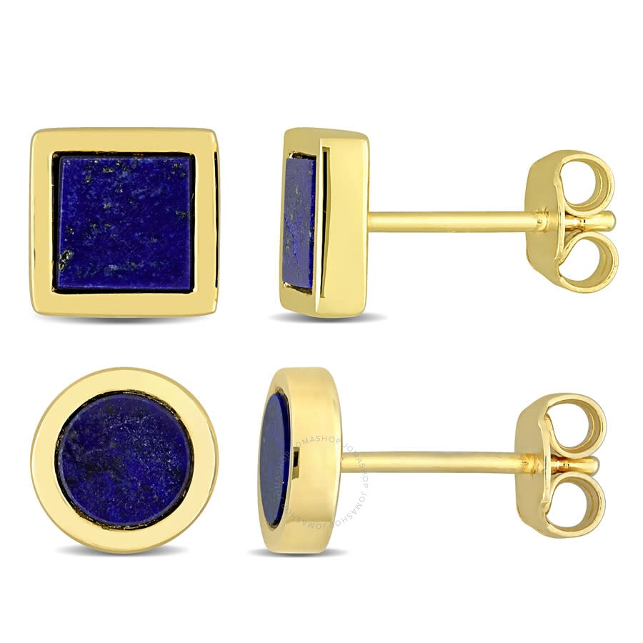 This men's 2-piece set features stud earrings adorned with lapis lazuli gemstones totaling 1 5/8 carats in weight. The set includes one pair of square-cut lapis lazuli stones and one pair of round-cut lapis lazuli stones, both set in yellow-toned sterling silver. These earrings combine the deep, rich blue hues of lapis lazuli with the warmth and elegance of yellow silver, creating a stylish and sophisticated accessory that can complement both casual and formal attire. GENERAL Stone Shape: Round Color: Yellow INFORMATION Brand: Amour Gender: Mens Model: JMS011460 DETAILS Necklaces: Stud Material : Sterling Silver Metal Stamp: 925-Sterling Metal Weight: 0.52 Stone Type: Other Stone Weight: 0.6 Stone Color: Blue Stone Cut: Round Stone Origin: Natural Total Stones: 4 ADDITIONAL INFO Additional Info: Square dou Jomashop Sku: AMR-JMS011460 Department: Jewelry Category: Set