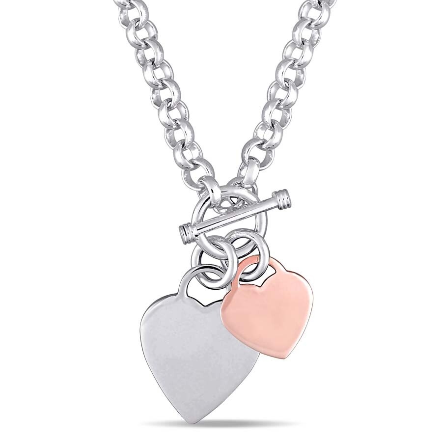 AMOUR Oval Link Necklace with Double Heart Charm and Toggle Clasp In 2-Tone Rose and White Sterling