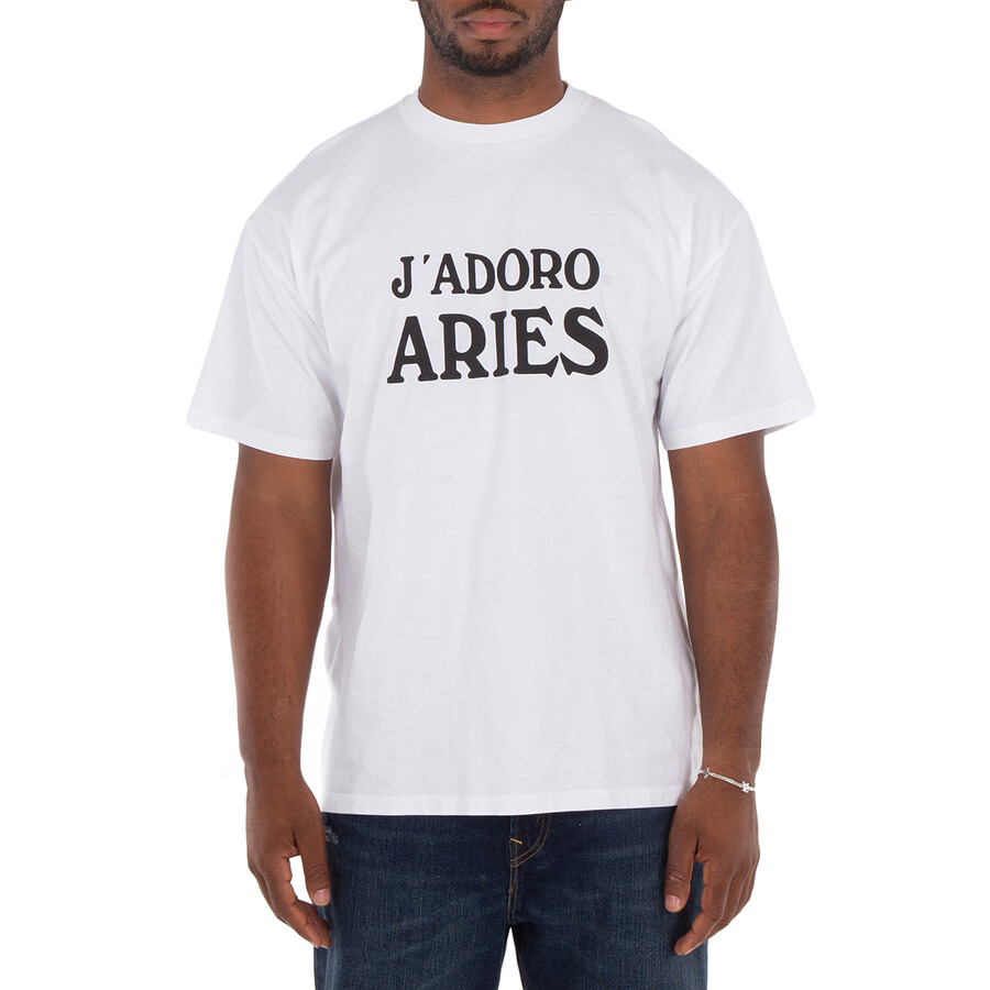 Aries Men's Tops. Fashion category: T-Shirts & Henleys. SKU: AR6000602-WHITE. Color: White. Aries Men's White Baby Fit JDoro T-Shirt. This cotton t-shirt features a classic crewneck and short sleeves for a comfortable, casual fit. It has a straight hem for a clean, modern silhouette. The t-shirt is completed with the phrase "J'Adoro Aries" printed on the front, adding a bold and stylish touch. 100% Cotton. Made in Italy. GENERAL Color: White INFORMATION Brand: Aries Gender: Mens Model: AR6000602-WHITE DETAILS Category: Tops Apparel Type: T-Shirts & Henleys Material: Cotton ADDITIONAL INFO Jomashop Sku: -AR6000602WHITE Department: Clothing