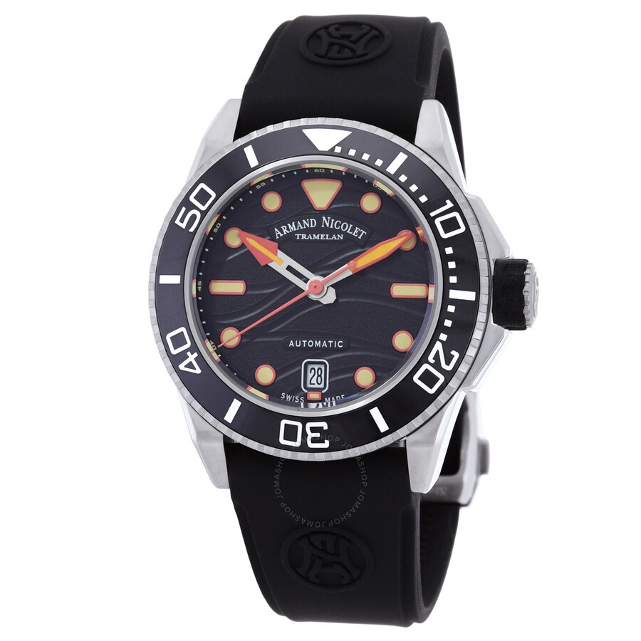 Silver-tone stainless steel case with a black rubber strap. Uni-directional rotating black ceramic bezel. Black dial with silver-tone hands and index hour markers. Minute markers around the outer rim. Dial Type: Analog. Luminescent hands and markers. Date display at the 6 o'clock position. Automatic movement. Scratch resistant sapphire crystal. Round case shape, case size: 41 mm. Deployment clasp. Water resistant at 300 meters / 1000 feet. Functions: date, hour, minute, second. Jsh Series. Watch label: Swiss Made. Armand Nicolet JSH Automatic Black Dial Men's Watch A481PGN-NO-GG2710N. GENERAL Box Type: Original Box CASE Case Size: 41 Case Material: Stainless Steel Case Shape: Round BAND Band Material: Rubber Band Type: Strap Band Color: Black Clasp: Deployment DIAL Dial Color: Black Type: Analog Crystal: Scratch Resistant Sapphire Hands: Silver-tone Dial Markers: Index Second Markers: Minute Markers around the outer rim Luminiscence: Hands and Markers Bezel: Uni-directional Rotating Bezel Color: Black Bezel Material: Ceramic INFORMATION Brand: Armand Nicolet Series: Jsh Collection Name: JSH Gender: Mens Model: A481PGN-NO-GG2710N Watch Label: Swiss Made Movement: Automatic FEATURES Water Resistance: 300 meters / 1000 feet Calendar: Date display at the 6 o'clock position Functions: Date, Hour, Minute, Second Watch Features: Analog, Ceramic, Rubber, Stainless Steel ADDITIONAL INFO Warranty: 2 Year Jomashop Warranty Jomashop Sku: Z-TXVM9 Department: Watches
