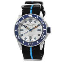 Silver-tone stainless steel case with a black and blue NATO band. Uni-directional rotating blue ceramic bezel. White dial with silver-tone hands and index hour markers. Minute markers around the outer rim. Dial Type: Analog. Luminescent hands and markers. Date display at the 6 o'clock position. Automatic movement. Scratch resistant sapphire crystal. Round case shape, case size: 44 mm. Buckle clasp. Water resistant at 300 meters / 1000 feet. Functions: date, hour, minute, second. Jsh Series. Watch label: Swiss Made. Armand Nicolet JSH Automatic White Dial Men's Watch A480PGU-AU-BN24480AANU. CASE Case Size: 44 Case Material: Stainless Steel Case Shape: Round BAND Band Material: NATO Band Type: Strap Band Color: Black and Blue Clasp: Buckle DIAL Dial Color: White Type: Analog Crystal: Scratch Resistant Sapphire Hands: Silver-tone Dial Markers: Index Second Markers: Minute Markers around the outer rim Luminiscence: Hands and Markers Bezel: Uni-directional Rotating Bezel Color: Blue Bezel Material: Ceramic INFORMATION Brand: Armand Nicolet Series: Jsh Collection Name: JSH Gender: Mens Model: A480PGU-AU-BN24480AANU Watch Label: Swiss Made Movement: Automatic FEATURES Water Resistance: 300 meters / 1000 feet Calendar: Date display at the 6 o'clock position Functions: Date, Hour, Minute, Second Watch Features: Stainless Steel, Ceramic, Analog ADDITIONAL INFO Warranty: 2 Year Jomashop Warranty Jomashop Sku: Z-XV67C Department: Watches