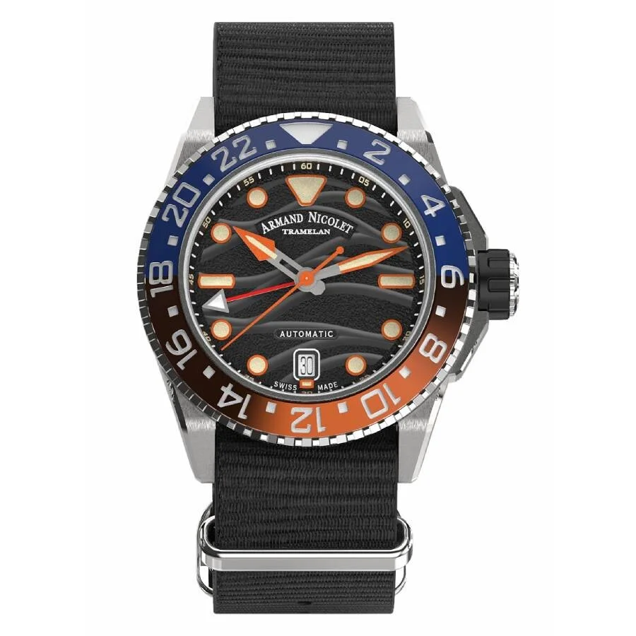 Silver-tone stainless steel case with a black NATO band. Rotating blue and orange ceramic bezel. Black dial with silver-tone hands and index hour markers. Minute markers around the outer rim. Dial Type: Analog. Luminescent hands and markers. Date display at the 6 o'clock position. Sellita Caliber SW330 Automatic movement, containing 25 Jewels, bitting at 28800 vph, and has a power reserve of approximately 42 hours. Scratch resistant sapphire crystal. Solid case back. Round case shape, case size: 41 mm. Tang clasp. Water resistant at 300 meters / 1000 feet. Functions: date, GMT, second time zone, hour, minute, second. Jsh Series. Watch label: Swiss Made. Armand Nicolet JSH GMT Automatic Black Dial Men's Watch A487RGN-NO-BN24481AANN. GENERAL Box Type: Original Box CASE Case Diameter: 41 mm Case Material: Stainless Steel Case Shape: Round Case Back: Solid BAND Band Material: NATO Band Type: Strap Band Color: Black Clasp: Tang DIAL Dial Color: Black Type: Analog Crystal: Scratch Resistant Sapphire Hands: Silver-tone Dial Markers: Index Second Markers: Minute Markers around the outer rim Luminiscence: Hands and Markers Bezel: Rotating Bezel Color: Blue and Orange Bezel Material: Ceramic INFORMATION Brand: Armand Nicolet Series: Jsh Collection Name: JSH Gender: Mens Model: A487RGN-NO-BN24481AANN Watch Label: Swiss Made Movement: Automatic Engine: Sellita Caliber SW330 Power Reserve: 42 hours FEATURES Water Resistance: 300 meters / 1000 feet Calendar: Date display at the 6 o'clock position Functions: Date, GMT, Second Time Zone, Hour, Minute, Second Watch Features: Analog, GMT, Ceramic, Stainless Steel, Time Zone ADDITIONAL INFO Warranty: 2 Year Jomashop Warranty Jomashop Sku: Z-KU6KC Department: Watches