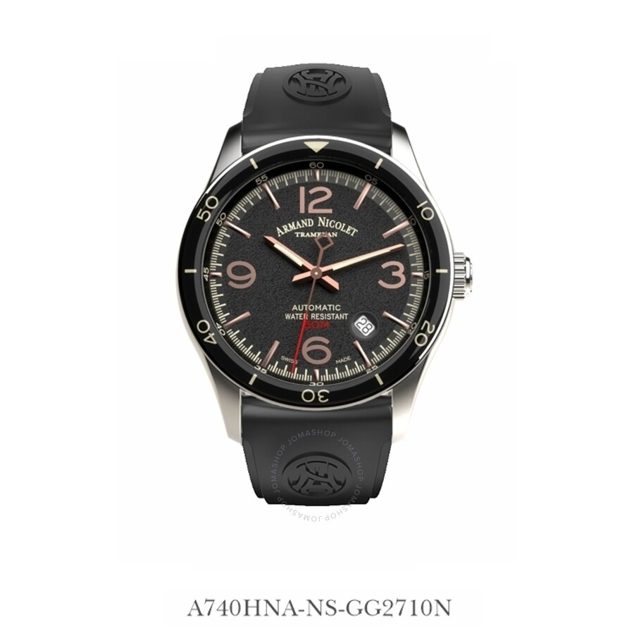 Silver-tone stainless steel case with a black rubber strap. Fixed black acrylic bezel. Black dial with rose gold-tone hands and Arabic numeral & index hour markers. Minute markers around the outer rim. Dial Type: Analog. Luminescent hands. Between the 4 and 5 o'clock position. Date AN200 (based on SW-200 modified per Armand Nicolet’s specifications) automatic movement. Scratch resistant sapphire crystal. Pull / push crown. Transparent case back. Round case shape, case size: 41 mm, case thickness: 11.9 mm. Band width: 22 mm. Deployment with push button release clasp. Water resistant at 50 meters / 165 feet. Functions: date, hour, minute, second. Additional Info: the 41 mm stainless steel case features a fixed black acrylic bezel. the frosted dial comes in four combinations of color. M2h Series. Dress watch style. Watch label: SWISS MADE. Armand Nicolet M2H Automatic Black Dial Men's Watch A740HNA-NS-GG2710N. CASE Case Size: 41 Case Thickness: 11.9 mm Case Material: Stainless Steel Case Shape: Round Case Back: Transparent BAND Band Material: Rubber Band Type: Strap Band Color: Black Band Width: 22 mm Clasp: Deployment with Push Button Release DIAL Dial Color: Black Type: Analog Crystal: Scratch Resistant Sapphire Hands: Rose Gold-tone Dial Markers: Arabic Numeral & Index Second Markers: Minute Markers around the outer rim Luminiscence: Hands Bezel: Fixed Bezel Color: Black Bezel Material: Acrylic Crown: Pull / Push INFORMATION Brand: Armand Nicolet Series: M2H Collection Name: M2H Gender: Mens Model: A740HNA-NS-GG2710N Watch Label: SWISS MADE Movement: Automatic Engine: Date AN200 (based on SW-200 modified per Armand Nicolet’s specifications) FEATURES Water Resistance: 50 meters / 165 feet Calendar: Between the 4 and 5 o'clock position Functions: Date, Hour, Minute, Second Watch Features: Analog, Gold, Rubber, Stainless Steel ADDITIONAL INFO Watch Style: Dress Warranty: With Manufacturers Guarantee Additional Info: The 41 mm stainless steel case features a fixed black acrylic bezel. The frosted dial comes in four combinations of color. Jomashop Sku: Y-A4M2M Department: Watches