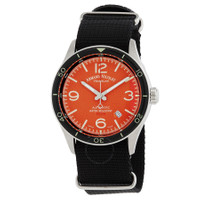 Silver-tone stainless steel case with a black NATO band. Uni-directional rotating black stainless steel bezel. Orange dial with silver-tone hands and index-Arabic numeral hour markers. Arabic numerals appear at the 3, 9 and 12 o'clock positions. Arabic numeral minute markers (at 5 minute intervals). Minute markers around the outer rim. Dial Type: Analog. Date display between 4 and 5 o'clock position. Automatic movement. Scratch resistant sapphire crystal. Pull / push crown. Transparent case back. Round case shape, case size: 41 mm. Buckle clasp. Water resistant at 50 meters / 165 feet. Functions: date, hour, minute, second. M2h Series. Sport watch style. Watch label: Swiss Made. Armand Nicolet M2H Automatic Orange Dial Men's Watch A740HNA-OR-BN22481AANN. CASE Case Size: 41 Case Material: Stainless Steel Case Shape: Round Case Back: Transparent BAND Band Material: NATO Band Type: Strap Band Color: Black Clasp: Buckle DIAL Dial Color: Orange Type: Analog Crystal: Scratch Resistant Sapphire Hands: Silver-tone Dial Markers: Index-Arabic Numeral Second Markers: Arabic Numerals appear at the 3, 9 and 12 o'clock positions. Arabic Numeral Minute Markers (at 5 minute intervals). Minute Markers around the outer rim Bezel: Uni-directional Rotating Bezel Color: Black Bezel Material: Stainless Steel Crown: Pull / Push INFORMATION Brand: Armand Nicolet Series: M2H Collection Name: M2H Gender: Mens Model: A740HNA-OR-BN22481AANN Watch Label: Swiss Made Movement: Automatic FEATURES Water Resistance: 50 meters / 165 feet Calendar: Date display between 4 and 5 o'clock position Functions: Date, Hour, Minute, Second Watch Features: Stainless Steel, Analog ADDITIONAL INFO Watch Style: Sport Warranty: 2 Year Jomashop Warranty Jomashop Sku: Z-SZRK6 Department: Watches