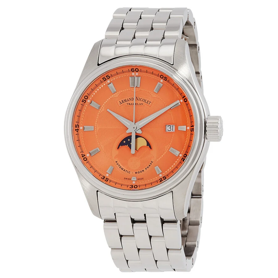 Silver-tone stainless steel case and bracelet. Fixed silver-tone stainless steel bezel. Salmon dial with silver-tone hands and index hour markers. Minute markers around the outer rim. Dial Type: Analog. Date display at the 3 o'clock position. Automatic movement. Scratch resistant sapphire crystal. Transparent case back. Round case shape, case size: 43 mm, case thickness: 13 mm. Band width: 22 mm. Fold over with double push button release clasp. Water resistant at 100 meters / 330 feet. Functions: moon-phase, date, hour, minute, second. Mh2 Series. Dress watch style. Watch label: Swiss Made. Armand Nicolet MH2 Automatic Salmon Dial Men's Watch A640L-SM-BMA22640A. GENERAL Box Type: Original Box CASE Case Diameter: 43 mm Case Thickness: 13 mm Case Material: Stainless Steel Case Shape: Round Case Back: Transparent BAND Band Material: Stainless Steel Band Type: Bracelet Band Color: Silver-tone Band Width: 22 mm Clasp: Fold Over with Double Push Button Release DIAL Dial Color: Salmon Type: Analog Crystal: Scratch Resistant Sapphire Hands: Silver-tone Dial Markers: Index Second Markers: Minute Markers around the outer rim Bezel: Fixed Bezel Color: Silver-tone Bezel Material: Stainless Steel INFORMATION Brand: Armand Nicolet Series: Mh2 Collection Name: MH2 Gender: Mens Model: A640L-SM-BMA22640A Watch Label: Swiss Made Movement: Automatic FEATURES Water Resistance: 100 meters / 330 feet Calendar: Date Display at the 3 o'clock position Functions: Moon-phase, Date, Hour, Minute, Second Watch Features: Analog, Stainless Steel, Moon Phase ADDITIONAL INFO Watch Style: Dress Warranty: With Manufacturers Guarantee Jomashop Sku: Z-LN9UL Department: Watches