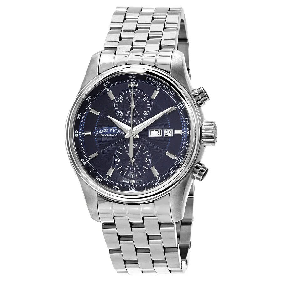 Silver-tone stainless steel case and bracelet. Fixed silver-tone stainless steel bezel. Blue dial with silver-tone hands and index hour markers. Arabic numeral minute markers (at 5 minute intervals). Minute markers, tachymeter markers around the outer rim. Dial Type: Analog. Luminescent hands and markers. Day of the week and date display at the 3 o'clock position. Chronograph - sub-dials displaying: two -30 minute and 12 hour. Sellita Caliber SW500 Automatic movement, containing 25 Jewels, bitting at 28800 vph, and has a power reserve of approximately 44 hours. Scratch resistant sapphire crystal. Transparent case back. Round case shape, case size: 42 mm, case thickness: 15 mm. Fold over clasp with a push button release. Water resistant at 100 meters / 330 feet. Functions: chronograph, date, day, hour, minute, small second. Mh2 Series. Dress watch style. Watch label: Swiss Made. Armand Nicolet MH2 Chronograph Automatic Blue Dial Men's Watch A647A-BU-BMA22640A. GENERAL Box Type: Original Box CASE Case Diameter: 42 mm Case Thickness: 15 mm Case Material: Stainless Steel Case Shape: Round Case Back: Transparent BAND Band Material: Stainless Steel Band Type: Bracelet Band Color: Silver-tone Clasp: Fold Over with Push Button Release DIAL Dial Color: Blue Type: Analog Crystal: Scratch Resistant Sapphire Hands: Silver-tone Dial Markers: Index Second Markers: Arabic Numeral Minute Markers (at 5 minute intervals). Minute Markers, Tachymeter Markers around the outer rim Sub Dials: Two -30 Minute and 12 Hour Luminiscence: Hands and Markers Bezel: Fixed Bezel Color: Silver-tone Bezel Material: Stainless Steel INFORMATION Brand: Armand Nicolet Series: Mh2 Collection Name: MH2 Gender: Mens Model: A647A-BU-BMA22640A Watch Label: Swiss Made Movement: Automatic Engine: Sellita Caliber SW500 Power Reserve: 44 hours FEATURES Water Resistance: 100 meters / 330 feet Calendar: Day of the Week and Date display at the 3 o'clock position Functions: Chronograph, Date, Day, Hour, Minute, Small Second Watch Features: Analog, Stainless Steel, Chronograph ADDITIONAL INFO Watch Style: Dress Warranty: 2 Year Jomashop Warranty Jomashop Sku: Z-U57P6 Department: Watches