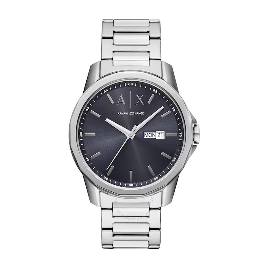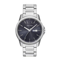 Silver-tone stainless steel case and bracelet. Fixed silver-tone stainless steel bezel. Dark blue dial with silver-tone hands and index hour markers. Minute markers around the outer rim. Day of the week and date display at the 3 o'clock position. Quartz movement. Scratch resistant mineral crystal. Pull / push crown. Solid case back. Round case shape, case size: 44. Fold over clasp with a safety release. Water resistant at 50 meters / 165 feet. Functions: date, day, hour, minute, second. Banks Series. Dress watch style. Watch label: Japan Movt. Armani Exchange Banks Quartz Dark Blue Bial Men's Watch AX1767. GENERAL Box Type: Original Box CASE Case Diameter: 44 Case Material: Stainless Steel Case Shape: Round Case Back: Solid BAND Band Material: Stainless Steel Band Type: Bracelet Band Color: Silver-tone Clasp: Fold Over with Safety Release DIAL Dial Color: Dark Blue Crystal: Scratch Resistant Mineral Hands: Silver-tone Dial Markers: Index Second Markers: Minute Markers around the outer rim Bezel: Fixed Bezel Color: Silver-tone Bezel Material: Stainless Steel Crown: Pull / Push INFORMATION Brand: Armani Exchange Series: Banks Collection Name: Banks Gender: Mens Model: AX1767 Watch Label: Japan Movt Movement: Quartz FEATURES Water Resistance: 50 meters / 165 feet Calendar: Day of the Week and Date display at the 3 o'clock position Functions: Date, Day, Hour, Minute, Second Watch Features: Stainless Steel ADDITIONAL INFO Watch Style: Dress UPC Code: 723763331692 Jomashop Sku: AX1767 Department: Watches