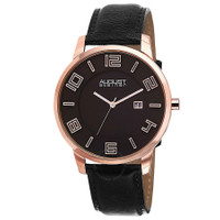 Rose gold-tone stainless steel case with a black leather strap. Fixed rose gold-tone bezel. Black dial with luminous rose gold-tone hands and alternating Arabic numeral and index hour markers. Dial Type: Analog. Luminescent hands. Date display at the 3 o'clock position. Quartz movement. Scratch resistant mineral crystal. Pull / push crown. Solid case back. Round case shape. Case size: 42 mm. Case thickness: 9 mm. Band width: 20 mm. Band length: 9 inches. Tang clasp. Water resistant at 30 meters / 100 feet. Functions: hour, minute, second. Additional Info: leather strap. Casual watch style. August Steiner Black Men's Watch AS8108BKR. INFORMATION Brand: August Steiner Gender: Mens Model: AS8108BKR Movement: Quartz CASE Case Size: 42 mm Case Thickness: 9 mm Case Material: Stainless Steel Case Shape: Round Case Back: Solid BAND Band Material: Leather Band Type: Strap Band Color: Black Band Length: 9 inches Band Width: 20 mm Clasp: Tang DIAL Dial Color: Black Type: Analog Crystal: Scratch Resistant Mineral Hands: Luminous Rose Gold-tone Dial Markers: Alternating Arabic Numeral and Index Luminiscence: Hands Bezel: Fixed Bezel Color: Rose Gold-tone Bezel Material: Stainless Steel Crown: Pull / Push FEATURES Water Resistance: 30 meters / 100 feet Calendar: Date display at the 3 o'clock position Functions: Hour, Minute, Second Watch Features: Stainless Steel, Leather, Gold, Analog ADDITIONAL INFO Watch Style: Casual Warranty: With Manufacturers Guarantee UPC Code: 848572029872 Additional Info: Leather strap Jomashop Sku: AS8108BKR Department: Watches Category: Watches