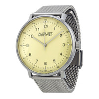 Stainless steel case with a stainless steel mesh bracelet. Fixed stainless steel bezel. Cream dial with silver-tone hands and Arabic numeral / index hour markers. Minute markers. Arabic numeral minute markers (at 5 minute intervals) around the outer rim. Dial Type: Analog. Quartz movement. Scratch resistant mineral crystal with a sapphire coating. Pull / push crown. Solid case back. Case diameter: 44 mm. Case thickness: 12 mm. Round case shape. Band width: 22 mm. Band length: 8.5 inches. Slip through clasp. Water resistant at 3 atm/30 meters/99 feet. Functions: hour, minute, second. Casual watch style. Watch label: Swiss Quartz. August Steiner Cream Dial Stainless Steel Mesh Men's Watch AS8091SS. INFORMATION Brand: August Steiner Gender: Mens Model: AS8091SS Watch Label: Swiss Quartz Movement: Quartz CASE Case Size: 44 mm Case Thickness: 12 mm Case Material: Stainless Steel Case Shape: Round Case Back: Solid BAND Band Material: Stainless Steel Mesh Band Type: Bracelet Band Color: Silver-tone Band Length: 8.5 inches Band Width: 22 mm Clasp: Slip Through DIAL Dial Color: Cream Type: Analog Crystal: Mineral with Sapphire coating Hands: Silver-tone Dial Markers: Arabic Numeral / Index Second Markers: Arabic Numeral Minute Markers (at 5 minute intervals). Minute Markers around the outer rim Bezel: Fixed Bezel Color: Silver-tone Bezel Material: Stainless Steel Crown: Pull / Push FEATURES Water Resistance: 30 meters / 100 feet Functions: Hour, Minute, Second Watch Features: Stainless Steel, Analog ADDITIONAL INFO Watch Style: Casual Warranty: With Manufacturers Guarantee UPC Code: 848572026086 Jomashop Sku: AS8091SS Department: Watches Category: Watches