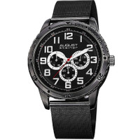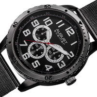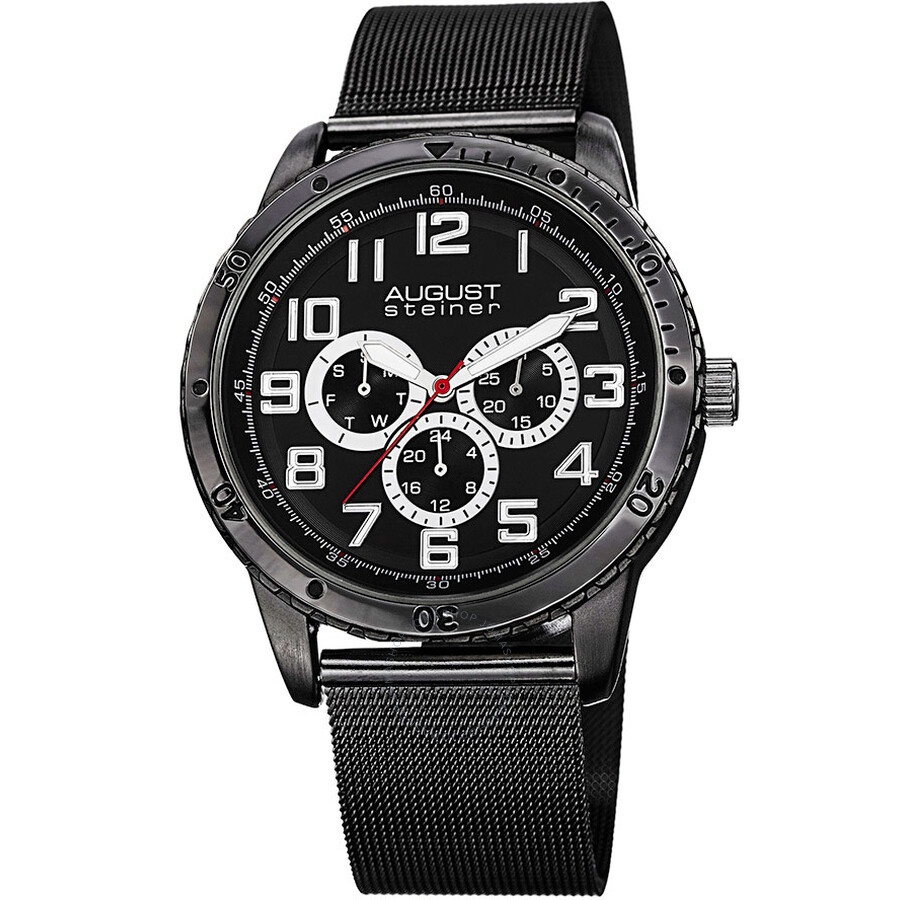 Black base metal case with a black ion-plated stainless steel mesh bracelet. Black ion-plated black base metal bezel. Black dial with luminous silver-tone hands and Arabic numeral hour markers. Arabic numeral minute markers (at 5 minute intervals). Minute markers around the outer rim. Dial Type: Analog. Luminescent hands and batons. Three multi-function sub-dials displaying: date, day of the week and 24 hour. Quartz movement. Scratch resistant mineral crystal. Pull / push crown. Solid case back. Round case shape. Case size: 45 mm. Case thickness: 11 mm. Band width: 22 mm. Band length: 8.5 inches. Fold over slip through clasp. Water resistant at 30 meters / 100 feet. Functions: hour, minute, second. Additional Info: subdials: day, date and GMT. Casual watch style. August Steiner Multi-Function Black Dial Black Ion-plated Men's Watch AS8115BK. INFORMATION Brand: August Steiner Gender: Mens Model: AS8115BK Movement: Quartz CASE Case Size: 45 mm Case Thickness: 11 mm Case Material: Base Metal Case Shape: Round Case Back: Solid BAND Band Material: Stainless Steel Mesh Band Type: Bracelet Band Color: Black Ion-plated Band Length: 8.5 inches Band Width: 22 mm Clasp: Fold Over Slip Through DIAL Dial Color: Black Type: Analog Crystal: Scratch Resistant Mineral Hands: Luminous Silver-tone Dial Markers: Arabic Numeral Second Markers: Arabic Numeral Minute Markers (at 5 minute intervals). Minute Markers around the outer rim Sub Dials: Three - Date, Day of the Week and 24 Hour Luminiscence: Hands and batons Bezel: Black Ion-plated Bezel Color: Black Bezel Material: Base Metal Crown: Pull / Push FEATURES Water Resistance: 30 meters / 100 feet Functions: Hour, Minute, Second Watch Features: Stainless Steel, GMT, Analog ADDITIONAL INFO Watch Style: Casual Warranty: With Manufacturers Guarantee UPC Code: 848572031363 Additional Info: Subdials: Day, date and GMT Jomashop Sku: AS8115BK Department: Watches Category: Watches