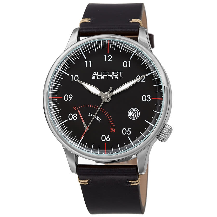 Silver-tone composite metal case with a black leather strap. Fixed silver-tone composite metal bezel. Black dial with luminous silver-tone hands and Arabic numeral hour markers. Minute markers around the outer rim. Dial Type: Analog. Luminescent hands. Date display at the 4 o'clock position. Retrograde 24 hour indicator. Quartz movement. Scratch resistant Hardlex crystal. Pull / push crown. Solid case back. Round case shape. Case size: 42 mm. Case thickness: 11 mm. Band width: 20 mm. Tang clasp. Water resistant at 30 meters / 100 feet. Functions: date, hour, minute, second. Casual watch style. August Steiner Quartz Black Dial Men's Watch AS8285SSB. INFORMATION Brand: August Steiner Gender: Mens Model: AS8285SSB Movement: Quartz CASE Case Size: 42 mm Case Thickness: 11 mm Case Material: Composite Metal Case Shape: Round Case Back: Solid BAND Band Material: Leather Band Type: Strap Band Color: Black Band Width: 20 mm Clasp: Tang DIAL Dial Color: Black Type: Analog Crystal: Scratch Resistant Hardlex Hands: Luminous Silver-tone Dial Markers: Arabic Numeral Second Markers: Minute Markers around the outer rim Sub Dials: Retrograde 24 Hour Indicator Luminiscence: Hands Bezel: Fixed Bezel Color: Silver-tone Bezel Material: Composite Metal Crown: Pull / Push FEATURES Water Resistance: 30 meters / 100 feet Calendar: Date display at the 4 o'clock position Functions: Date, Hour, Minute, Second Watch Features: Leather, Retrograde, Analog ADDITIONAL INFO Watch Style: Casual Warranty: With Manufacturers Guarantee UPC Code: 842106158212 Jomashop Sku: AS8285SSB Department: Watches Category: Watches