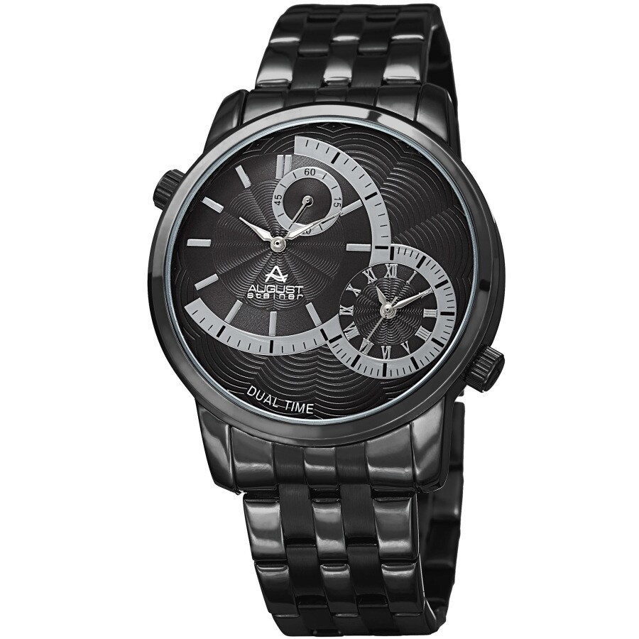 Black-plated composite metal case with a black-plated stainless steel bracelet. Fixed black-plated composite metal bezel. Grey (dual time) dial with silver-tone arrow-shaped hands and index hour markers. Minute markers around the outer rim. Dial Type: Analog. Small seconds sub-dial. Quartz movement. Scratch resistant mineral crystal. Pull / push crown. Solid case back. Round case shape. Case size: 44 mm. Case thickness: 9 mm. Band width: 22 mm. Band length: 8 inches. Fold over clasp. Water resistant at 30 meters / 100 feet. Functions: dual time, hour, minute, second. Dual Time Series. Fashion watch style. August Steiner Quartz Grey Dial Black-plated Men's Watch AS8210BK. INFORMATION Brand: August Steiner Series: Dual Time Collection Name: Dual Time Gender: Mens Model: AS8210BK Movement: Quartz CASE Case Size: 44 mm Case Thickness: 9 mm Case Material: Composite Metal Case Shape: Round Case Back: Solid BAND Band Material: Stainless Steel Band Type: Bracelet Band Color: Black-plated Band Length: 8 inches Band Width: 22 mm Clasp: Fold Over DIAL Dial Color: Grey (Dual Time) Type: Analog Crystal: Scratch Resistant Mineral Hands: Silver-tone Arrow-shaped Dial Markers: Index Second Markers: Minute Markers around the outer rim Sub Dials: Small Seconds Bezel: Fixed Bezel Color: Black-plated Bezel Material: Composite Metal Crown: Pull / Push FEATURES Water Resistance: 30 meters / 100 feet Functions: Dual Time, Hour, Minute, Second Watch Features: Stainless Steel, Analog ADDITIONAL INFO Watch Style: Fashion Warranty: With Manufacturers Guarantee UPC Code: 842106100891 Jomashop Sku: ASAS8210BK Department: Watches Category: Watches