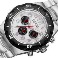 Silver-tone composite metal case with a silver-tone alloy bracelet. Fixed black-plated bezel. Silver dial with luminous silver-tone sword-shaped hands and Arabic numeral hour markers. Minute markers around the outer rim. Dial Type: Analog. Luminescent hands and markers. Date display at the 3 o'clock position. Three black multi-function sub-dials displaying: date, day of the week and 24 hour. Quartz movement. Scratch resistant mineral crystal. Pull / push crown. Solid case back. Round case shape. Case size: 44 mm. Case thickness: 11 mm. Band width: 28 mm. Band length: 8 inches. Fold over clasp. Water resistant at 10 meters / 33 feet. Functions: date, day, GMT, second time zone, hour, minute, second. Fashion watch style. August Steiner Quartz Silver Dial Men's Watch AS8161SS. INFORMATION Brand: August Steiner Gender: Mens Model: AS8161SS Movement: Quartz CASE Case Size: 44 mm Case Thickness: 11 mm Case Material: Composite Metal Case Shape: Round Case Back: Solid BAND Band Material: Alloy Band Type: Bracelet Band Color: Silver-tone Band Length: 8 inches Band Width: 28 mm Clasp: Fold Over DIAL Dial Color: Silver Type: Analog Crystal: Scratch Resistant Mineral Hands: Luminous Silver-tone Sword-shaped Dial Markers: Arabic Numeral Second Markers: Minute Markers around the outer rim Sub Dials: Three - Date, Day of the Week and 24 Hour Luminiscence: Hands and Markers Bezel: Fixed Bezel Color: Black-plated Bezel Material: Composite Metal Crown: Pull / Push FEATURES Water Resistance: 10 meters / 33 feet Calendar: Date display at the 3 o'clock position Functions: Date, Day, GMT, Second Time Zone, Hour, Minute, Second Watch Features: Time Zone, GMT, Analog ADDITIONAL INFO Watch Style: Fashion Warranty: With Manufacturers Guarantee UPC Code: 848572056663 Jomashop Sku: ASAS8161SS Department: Watches Category: Watches