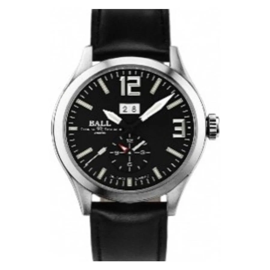 Silver-tone stainless steel case with a black leather strap. Fixed silver-tone stainless steel bezel. Black dial with silver-tone hands and index hour markers. Arabic numerals mark the 3 and 12 o'clock positions. Minute markers around the outer rim. Dial Type: Analog. Date display at the 12 o'clock position. One subdial displaying: 12 hour. Automatic movement with a 42-hour power reserve. Scratch resistant sapphire crystal. Screw down crown. Solid case back. Round case shape, case size: 40 mm, case thickness: 13.25 mm. Water resistant at 100 meters / 330 feet. Functions: date, hour, minute, second. Engineer Master II Voyager Series. Luxury watch style. Watch label: Swiss Made. Ball Engineer Master II Voyager Automatic Black Dial Men's Watch GM2286C-L6J-BK. GENERAL Box Type: Original Box CASE Case Diameter: 40 mm Case Thickness: 13.25 mm Case Material: Stainless Steel Case Shape: Round Case Back: Solid BAND Band Material: Leather Band Type: Strap Band Color: Black DIAL Dial Color: Black Type: Analog Crystal: Scratch Resistant Sapphire Hands: Silver-tone Dial Markers: Index Second Markers: Arabic Numerals mark the 3 and 12 o'clock positions. Minute Markers around the outer rim Sub Dials: One - 12 Hour Bezel: Fixed Bezel Color: Silver-tone Bezel Material: Stainless Steel Crown: Screw Down INFORMATION Brand: Ball Series: Engineer Master Ii Voyager Collection Name: Engineer Master II Voyager Gender: Mens Model: GM2286C-L6J-BK Watch Label: Swiss Made Movement: Automatic Power Reserve: 42 hours FEATURES Water Resistance: 100 meters / 330 feet Calendar: Date display at the 12 o'clock position Functions: Date, Hour, Minute, Second Watch Features: Analog, Leather, Stainless Steel ADDITIONAL INFO Watch Style: Luxury Warranty: 2 Year Jomashop Warranty Jomashop Sku: BALL-GM2286C-L6J-BK Department: Watches