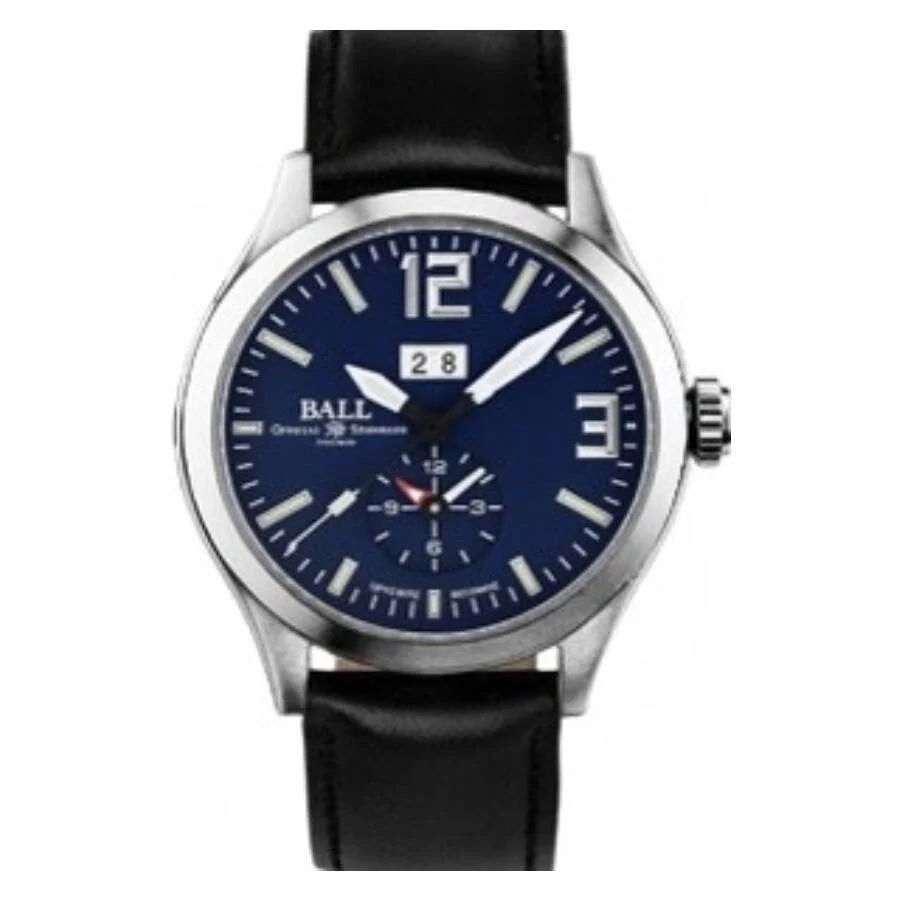 Silver-tone stainless steel case with a black leather strap. Fixed silver-tone stainless steel bezel. Blue dial with index hour markers. Arabic numerals mark the 3 and 12 o'clock positions. Minute markers around the outer rim. Dial Type: Analog. Date display at the 12 o'clock position. One subdial displaying: 12 hour. Automatic movement with a 42-hour power reserve. Scratch resistant sapphire crystal. Screw down crown. Solid case back. Round case shape, case size: 40 mm, case thickness: 13.25 mm. Band width: 22 mm. Water resistant at 100 meters / 330 feet. Functions: date, hour, minute, second. Engineer Master II Voyager Series. Luxury watch style. Watch label: Swiss Made. Ball Engineer Master II Voyager Automatic Blue Dial Men's Watch GM2286C-L6J-BE. GENERAL Box Type: Original Box CASE Case Diameter: 40 mm Case Thickness: 13.25 mm Case Material: Stainless Steel Case Shape: Round Case Back: Solid BAND Band Material: Leather Band Type: Strap Band Color: Black DIAL Dial Color: Blue Type: Analog Crystal: Scratch Resistant Sapphire Dial Markers: Index Second Markers: Arabic Numerals mark the 3 and 12 o'clock positions. Minute Markers around the outer rim Sub Dials: One - 12 Hour Bezel: Fixed Bezel Color: Silver-tone Bezel Material: Stainless Steel Crown: Screw Down INFORMATION Brand: Ball Series: Engineer Master Ii Voyager Collection Name: Engineer Master II Voyager Gender: Mens Model: GM2286C-L6J-BE Watch Label: Swiss Made Movement: Automatic Power Reserve: 42 hours FEATURES Water Resistance: 100 meters / 330 feet Calendar: Date display at the 12 o'clock position Functions: Date, Hour, Minute, Second Watch Features: Analog, Leather, Stainless Steel ADDITIONAL INFO Watch Style: Luxury Warranty: 2 Year Jomashop Warranty Jomashop Sku: BALL-GM2286C-L6J-BE Department: Watches