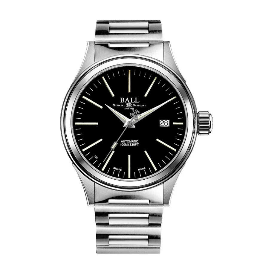 Stainless steel case with a stainless steel bracelet. Fixed stainless steel bezel. Black dial with luminous silver-tone hands and index hour markers. Minute markers around the outer rim. Dial Type: Analog. Luminescent hands and markers. Date display at the 3 o'clock position. BALL calibre RR1103 automatic movement, based upon ETA 2824-2, containing 25 Jewels, bitting at 28800 vph, and has a power reserve of approximately 38 hours. Scratch resistant sapphire crystal. Screw down crown. Solid case back. Round case shape. Case size: 40 mm. Case thickness: 11.3 mm. Band width: 20 mm. Fold over clasp. Water resistant at 100 meters / 330 feet. Functions: date, hour, minute, second. Fireman Enterprise Series. Dress watch style. Watch label: Swiss Made. Ball Fireman Enterprise Automatic Black Dial Men's Watch NM2098C-S20J-BK. GENERAL Box Type: Original Box CASE Case Diameter: 40 mm Case Thickness: 11.3 mm Case Material: Stainless Steel Case Shape: Round Case Back: Solid BAND Band Material: Stainless Steel Band Type: Bracelet Band Color: Silver-tone Band Width: 20 mm Clasp: Fold Over DIAL Dial Color: Black Type: Analog Crystal: Scratch Resistant Sapphire Hands: Luminous Silver-tone Dial Markers: Index Second Markers: Minute Markers around the outer rim Luminiscence: Hands and Markers Bezel: Fixed Bezel Color: Silver-tone Bezel Material: Stainless Steel Crown: Screw Down INFORMATION Brand: Ball Series: Fireman Enterprise Collection Name: Fireman Enterprise Gender: Mens Model: NM2098C-S20J-BK Watch Label: Swiss Made Movement: Automatic Engine: BALL Calibre RR1103 FEATURES Water Resistance: 100 meters / 330 feet Calendar: Date display at the 3 o'clock position Functions: Date, Hour, Minute, Second Watch Features: Analog, Stainless Steel ADDITIONAL INFO Watch Style: Dress Warranty: 2 Year Jomashop Warranty Jomashop Sku: BALL-NM2098CS20JBK Department: Watches Category: Watches