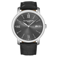 Stainless steel case with a black leather strap. Fixed silver-tone stainless steel bezel. Grey dial with Roman numeral & index hour markers. Dial Type: Analog. Date display at the 3 o'clock position. Quartz (ETA F06.111) quartz movement. Scratch resistant sapphire crystal. Pull / push crown. Solid case back. Round case shape, case size: 42 mm, case thickness: 6 mm. Band width: 22 mm, band length: 8 inches. Tang clasp. Water resistant at 30 meters / 100 feet. Additional Info: hours, minutes, date. Classima Series. Luxury watch style. Baume et Mercier Classima Grey Dial Men's Watch M0A10191. GENERAL Box Type: Original Box CASE Case Size: 42 Case Thickness: 6 mm Case Material: Stainless Steel Case Shape: Round Case Back: Solid BAND Band Material: Leather Band Type: Strap Band Color: Black Band Length: 8 inches Band Width: 22 mm Clasp: Tang DIAL Dial Color: Grey Type: Analog Crystal: Scratch Resistant Sapphire Dial Markers: Roman Numeral & Index Bezel: Fixed Bezel Color: Silver-tone Bezel Material: Stainless Steel Crown: Pull / Push INFORMATION Brand: Baume Et Mercier Series: Classima Collection Name: Classima Gender: Mens Model: M0A10191 Movement: Quartz Engine: Quartz (ETA F06.111) FEATURES Water Resistance: 30 meters / 100 feet Calendar: Date Display at the 3 o'clock position Watch Features: Stainless Steel, Leather, Analog ADDITIONAL INFO Watch Style: Luxury Additional Info: Hours, Minutes, Date Jomashop Sku: BMMOA10191 Department: Watches