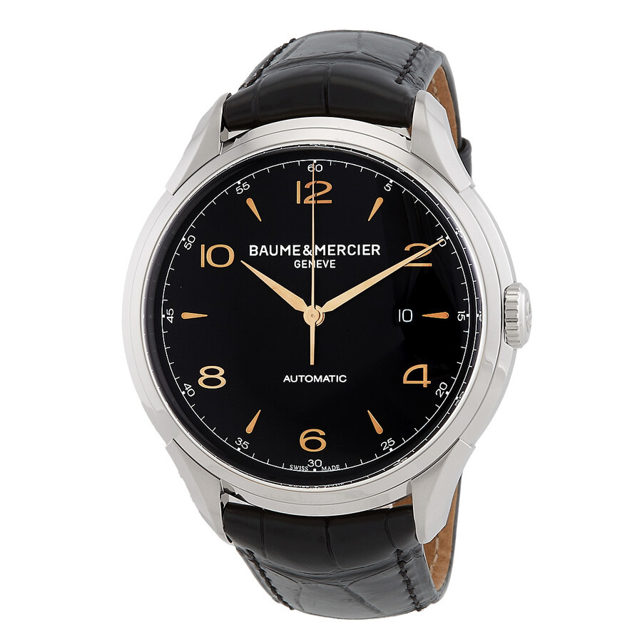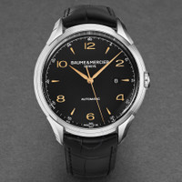 Silver-tone stainless steel case with a black leather strap. Fixed silver-tone stainless steel bezel. Black dial with Arabic numeral & index hour markers. Minute markers around the outer rim. Dial Type: Analog. Date display at the 3 o'clock position. Automatic movement. Scratch resistant sapphire crystal. Pull / push crown. Solid case back. Round case shape, case size: 45 mm, case thickness: 12 mm. Band width: 22 mm, band length: 8 inches. Tang clasp. Water resistant at 50 meters / 165 feet. Functions: date, hour, minute, second. Additional Info: hours, minutes, seconds, date. Clifton Series. Luxury watch style. Watch label: Swiss Made. Baume et Mercier Clifton Automatic Black Dial Men's Watch M0A10366. INFORMATION Brand: Baume Et Mercier Series: Clifton Collection Name: Clifton Gender: Mens Model: M0A10366 Watch Label: Swiss Made Movement: Automatic CASE Case Size: 45 mm Case Thickness: 12 mm Case Material: Stainless Steel Case Shape: Round Case Back: Solid BAND Band Material: Leather Band Type: Strap Band Color: Black Band Length: 8 inches Band Width: 22 mm Clasp: Tang DIAL Dial Color: Black Type: Analog Crystal: Scratch Resistant Sapphire Dial Markers: Arabic Numeral & Index Second Markers: Minute Markers around the outer rim Bezel: Fixed Bezel Color: Silver-tone Bezel Material: Stainless Steel Crown: Pull / Push FEATURES Water Resistance: 50 meters / 165 feet Calendar: Date Display at the 3 o'clock position Functions: Date, Hour, Minute, Second Watch Features: Stainless Steel, Leather, Analog ADDITIONAL INFO Watch Style: Luxury Additional Info: Hours, Minutes, Seconds, Date Jomashop Sku: BMMOA10366 Department: Watches Category: Watches