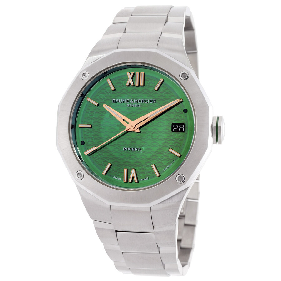 Silver-tone stainless steel case and bracelet. Fixed silver-tone stainless steel bezel. Green dial with rose gold-tone hands and index-Roman numeral hour markers. Dial Type: Analog. Date display at the 3 o'clock position. Automatic movement with a 120-hour power reserve. Scratch resistant sapphire crystal. Pull / push crown. Transparent see through case back. Case size: 39 mm, case thickness: 10.21 mm. Water resistant at 100 meters / 330 feet. Functions: date, hour, minute, second. Riviera Series. Dress watch style. Watch label: Swiss Made. Baume et Mercier Riviera Automatic Green Dial Watch M0A10770. GENERAL Box Type: Original Box CASE Case Thickness: 10.21 mm Case Material: Stainless Steel Case Back: Transparent See Through BAND Band Material: Stainless Steel Band Type: Bracelet Band Color: Silver-tone DIAL Dial Color: Green Type: Analog Crystal: Scratch Resistant Sapphire Hands: Rose Gold-tone Dial Markers: Index-Roman Numeral Bezel: Fixed Bezel Color: Silver-tone Bezel Material: Stainless Steel Crown: Pull / Push INFORMATION Brand: Baume Et Mercier Series: Riviera Collection Name: Riviera Gender: Mens Model: M0A10770 Watch Label: Swiss Made Movement: Automatic Power Reserve: 120 hours FEATURES Water Resistance: 100 meters / 330 feet Calendar: Date display at the 3 o'clock position Functions: Date, Hour, Minute, Second Watch Features: Stainless Steel, Gold, Analog ADDITIONAL INFO Watch Style: Dress Jomashop Sku: BMM0A10770 Item Variation: MOA10770, A10770, 10770 Department: Watches
