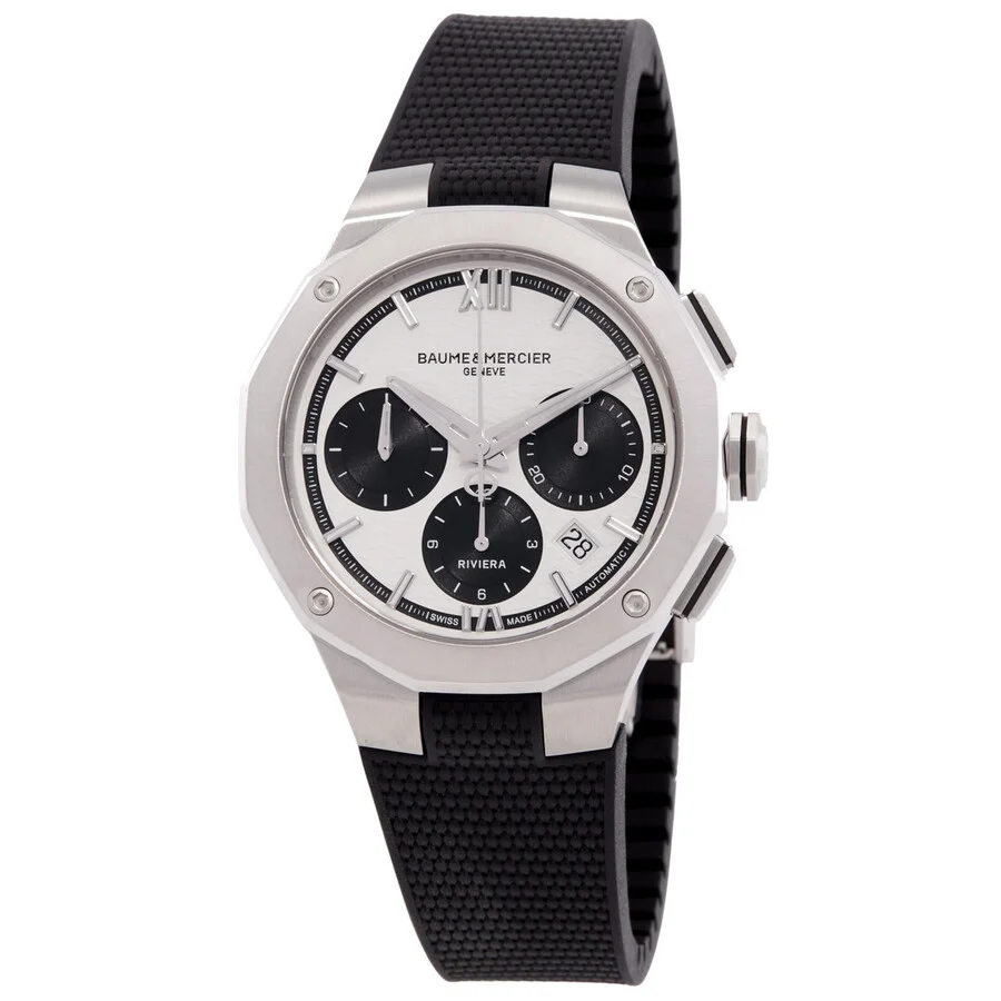 Silver-tone stainless steel case with a black rubber strap. Fixed silver-tone stainless steel bezel. Argent noir, opaline, sunray dial with index-Roman numeral hour markers. Minute markers around the outer rim. Dial Type: Analog. Luminescent hands and markers. Date display between 4 and 5 o'clock position. Chronograph - three sub-dials displaying: 60 second, 30 minute and 12 hour. ETA-Valjoux Caliber 7753 Automatic movement, based upon ETA 7750, containing 27 Jewels, bitting at 28800 vph, and has a power reserve of approximately 44 hours. Scratch resistant sapphire crystal. Transparent see through case back. Dodecagon case shape, case size: 41 mm, case thickness: 13.94 mm. Water resistant at 100 meters / 330 feet. Functions: chronograph, date, hour, minute, second. Riviera Series. Sport watch style. Watch label: Swiss Made. Baume et Mercier Riviera Chronograph Automatic Men's Watch M0A10865. GENERAL Box Type: Original Box CASE Case Diameter: 41 mm Case Thickness: 13.94 mm Case Material: Stainless Steel Case Shape: Dodecagon Case Back: Transparent See Through BAND Band Material: Rubber Band Type: Strap Band Color: Black DIAL Dial Color: Argent Noir, Opaline, Sunray Type: Analog Crystal: Scratch Resistant Sapphire Dial Markers: Index-Roman Numeral Second Markers: Minute Markers around the outer rim Sub Dials: Three - 60 Second, 30 Minute and 12 Hour Luminiscence: Hands and Markers Bezel: Fixed Bezel Color: Silver-tone Bezel Material: Stainless Steel INFORMATION Brand: Baume Et Mercier Series: Riviera Collection Name: Riviera Gender: Mens Model: M0A10865 Watch Label: Swiss Made Movement: Automatic Engine: ETA-Valjoux Caliber 7753 Power Reserve: 48 hours FEATURES Water Resistance: 100 meters / 330 feet Calendar: Date display between 4 and 5 o'clock position Functions: Chronograph, Date, Hour, Minute, Second Watch Features: Analog, Rubber, Stainless Steel, Chronograph ADDITIONAL INFO Watch Style: Sport Jomashop Sku: BMM0A10865 Department: Watches