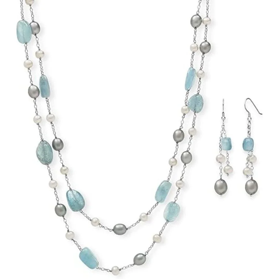 This elegant multi-strand pearl and natural aquamarine jewelry set features sterling silver chain links, making it hypoallergenic and nickel-free, perfect for sensitive skin. The set includes a stylish layered station necklace with 16-inch and 18-inch chains, plus a 2-inch extender, and matching 2-inch drop earrings. Packaged in a fine jewelry gift box, it's an ideal gift for any occasion. GENERAL Color: Blue INFORMATION Brand: Belacqua Gender: Womens Model: QSET-11247-AMZ DETAILS Size Info: 16 inches Necklaces: Multi-Strand Ring Style: Fashion Chain Type: Link Closure Type: Lobster Material : Sterling Silver Metal Stamp: 925-Sterling Stone Type: Aquamarine Stone Origin: Natural ADDITIONAL INFO Jomashop Sku: Y-A5MXB Department: Jewelry Category: Set