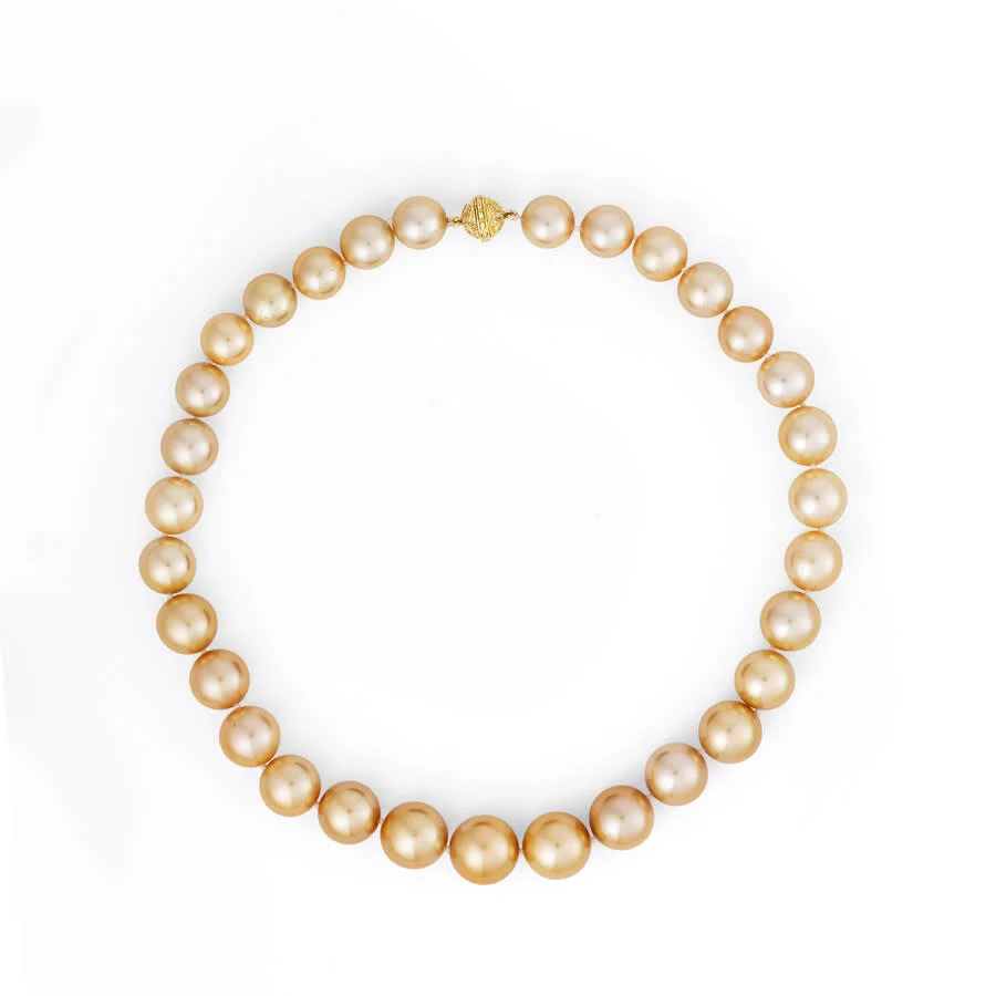 This refined graduated strand necklace highlights round golden South Sea pearls in sizes 12.0–15.5mm, set with a polished 14K yellow gold clasp. Designed in an 18-inch length, it blends timeless beauty with bold pearl brilliance for premium fine jewelry appeal. Belacqua Ladies Necklaces. High End Pearl Collection series. SKU: NSG-U. Color: Gold-tone. Metal Type: White Gold. Metal Stamp: No Stamp. Gem stone type: Pearl. Number of stones: 31. Necklace style: Single Strand. Chain type: Bead. Closure type: Ball. Belacqua Round Golden South Sea Pearl Graduated Strand Necklace in 14K Yellow Gold,12.0-15.5mm Pearls, 18 Inches. GENERAL Color: Gold-tone Collection Name: High End Pearl Collection INFORMATION Brand: Belacqua Series: High End Pearl Collection Gender: Womens Model: NSG-U DETAILS Size Info: 18 inches Necklaces: Single Strand Ring Style: Fashion Chain Type: Bead Closure Type: Ball Material : White Gold Metal Stamp: No Stamp Stone Type: Pearl Total Stones: 31 ADDITIONAL INFO Jomashop Sku: Y-A5XX5 Department: Jewelry Category: Necklaces