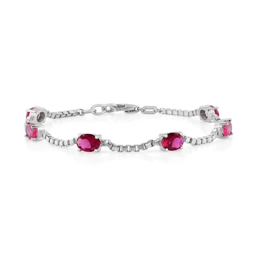 Radiant oval-cut 5×7 mm Siam ruby stones bring bold red brilliance to this Belacqua July birthstone bracelet. Crafted in sterling silver with a classic tennis bracelet design, it offers a 7.5-inch length and secure lobster claw clasp. Symbolizing passion and vitality, it’s a striking gift presented in an included gift box. GENERAL Stone Shape: Oval Color: Red INFORMATION Brand: Belacqua Gender: Womens Model: UDB0061H-DWRB DETAILS Size Info: 7.5 inches Bracelet Style : Tennis Ring Style: Fashion Chain Type: Box Closure Type: Lobster Material : Sterling Silver Metal Stamp: 925-Sterling Stone Type: Ruby Stone Cut: Oval Stone Origin: Natural Total Stones: 6 ADDITIONAL INFO Jomashop Sku: Y-A5T9M Department: Jewelry Category: Bracelets