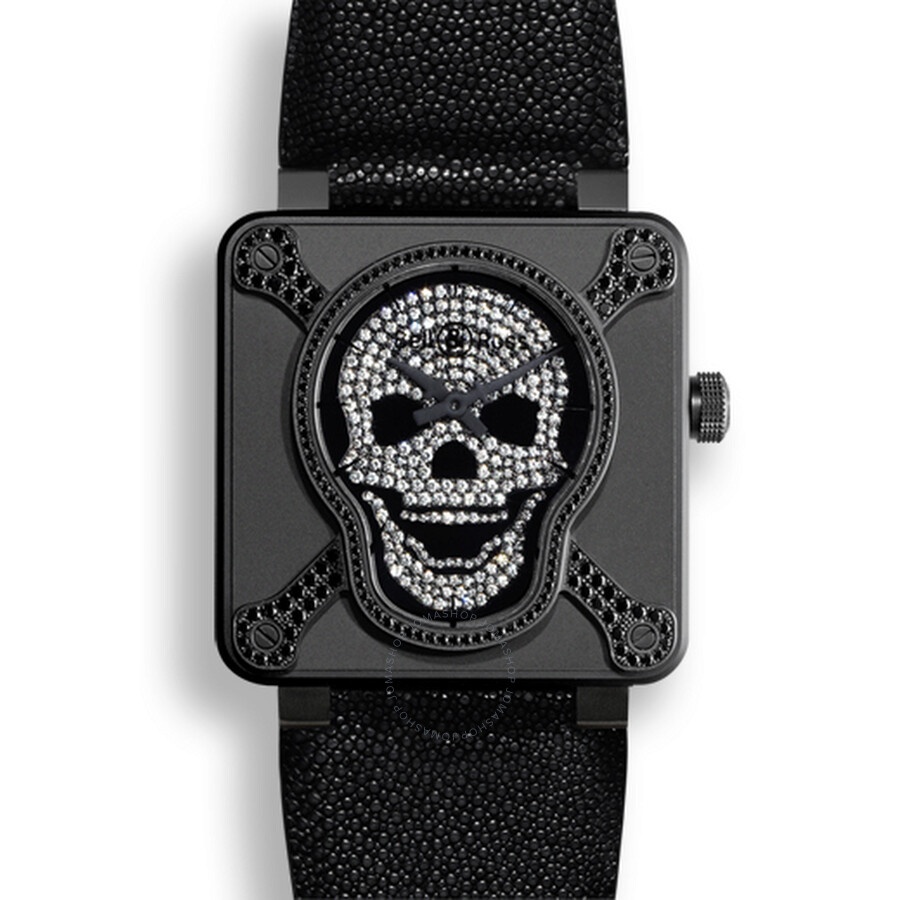 Brushed black PVD titanium case with a black shagreen strap band. Fixed, black carbon set with black diamonds black diamond set and titanium bezel. Black set with white diamonds dial with black hands. Dial Type: Analog. ETA Caliber 2892 automatic movement with a 42-hour power reserve. Scratch resistant sapphire crystal. Screw down crown. Solid case back. Square case shape. Case size: 46 mm x 46 mm. Band length: 7 inches. Tang clasp. Water resistant at 100 meters / 330 feet. Functions: hour, minute. Luxury watch style. Watch label: Swiss Movt. Item Variations: BR0192 AIRBOR LGD, BR0192.AIRBOR.LGD, BR0192AIRBORLGD. Bell and Ross Aviation BR 01 Automatic Diamond Men's Watch BR0192-AIRBOR-LGD. GENERAL Box Type: Original Box Color: Black / Tan / White CASE Case Size: 46 Case Material: Titanium Case Shape: Square Case Back: Solid BAND Band Material: Shagreen Strap Band Type: Strap Band Color: Black Band Length: 7 inches Clasp: Tang DIAL Dial Color: Black set with white diamonds Type: Analog Crystal: Scratch Resistant Sapphire Hands: Black Bezel: Fixed, Black carbon set with black diamonds Bezel Color: Black Bezel Material: Diamond Set and Titanium Crown: Screw Down INFORMATION Brand: Bell And Ross Series: Aviation Br 01 Collection Name: Aviation BR 01 Gender: Mens Model: BR0192-AIRBOR-LGD Watch Label: Swiss Movt Movement: Automatic Engine: ETA Caliber 2892 Power Reserve: 42 hours FEATURES Water Resistance: 100 meters / 330 feet Functions: Hour, Minute Watch Features: Analog, Titanium, Diamond ADDITIONAL INFO Watch Style: Luxury Warranty: 2 Year Jomashop Warranty Jomashop Sku: BLRBR0192-AIR-TI Item Variation: BR0192 AIRBOR LGD, BR0192.AIRBOR.LGD, BR0192AIRBORLGD Department: Watches Category: Watches