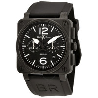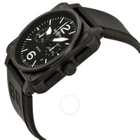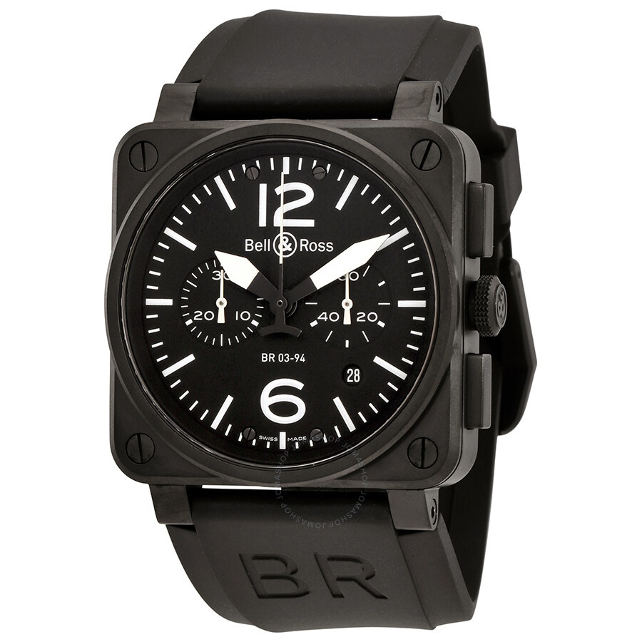 Black PVD stainless steel case with a black rubber strap. Fixed black PVD bezel. Black dial with white hands and index hour markers. Arabic numerals mark the 6 and 12 o'clock positions. Minute markers around the outer rim. Dial Type: Analog. Date display between the 4 and 5 o'clock positions. Chronograph - two sub-dials displaying: 60 second and 30 minute. Bell and Ross calibre BR-CAL.301 automatic movement, based upon ETA 2894-2, containing 37 Jewels, bitting at 28800 vph, and has a power reserve of approximately 42 hours. Scratch resistant sapphire crystal. Screw down crown. Solid case back. Square case shape. Case size: 42 mm. Case thickness: 12.6 mm. Tang clasp. Water resistant at 100 meters / 330 feet. Functions: chronograph, date, hour, minute, second. Aviation Series. Luxury watch style. Watch label: Swiss Made. Bell and Ross Aviation Chronograph Automatic Men's Watch BR0394-BL-ST-CA. GENERAL Box Type: Original Box CASE Case Size: 42 Case Thickness: 12.6 mm Case Material: Stainless Steel Case Shape: Square Case Back: Solid BAND Band Material: Rubber Band Type: Strap Band Color: Black Clasp: Tang DIAL Dial Color: Black Type: Analog Crystal: Scratch Resistant Sapphire Hands: White Dial Markers: Index Second Markers: Arabic Numerals mark the 6 and 12 o'clock positions. Minute Markers around the outer rim Sub Dials: Two - 60 Second and 30 Minute Bezel: Fixed Bezel Color: Black PVD Bezel Material: Stainless Steel Crown: Screw Down INFORMATION Brand: Bell And Ross Series: Aviation Collection Name: Aviation Gender: Mens Model: BR0394-BL-ST-CA Watch Label: Swiss Made Movement: Automatic Engine: Bell and Ross Calibre BR-CAL.301 Power Reserve: 42 hours FEATURES Water Resistance: 100 meters / 330 feet Calendar: Date display between the 4 and 5 o'clock positions Functions: Chronograph, Date, Hour, Minute, Second Watch Features: Analog, Rubber, Stainless Steel, Chronograph ADDITIONAL INFO Watch Style: Luxury Warranty: 2 Year Jomashop Warranty UPC Code: 845960004701 Jomashop Sku: BLRBR0394-BL-ST-CA Department: Watches Category: Watches