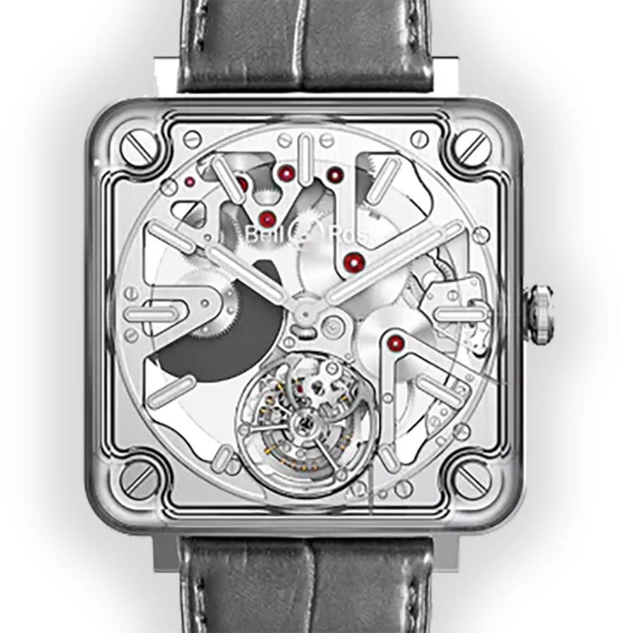 Satin-polished steel case with a grey alligator leather strap. Fixed bezel. Skeleton dial with silver-tone hands. Dial Type: Analog. Bell and Ross Calibre BR-CAL.381 automatic movement. Scratch resistant sapphire crystal. Transparent see through case back. Square case shape, case size: 42.5 mm. Folding clasp. Water resistant at 50 meters / 165 feet. Functions: hour, minute, flying tourbillon. Additional Info: limited edition of 50 pieces. Br-x2 Tourbillon Micro Rotor Series. Luxury watch style. Watch label: Swiss Made. Bell and Ross BR-X2 Tourbillon Micro Rotor Automatic Men's Limited Edition Watch BRX2-MRTB-SK-ST. GENERAL Box Type: Original Box CASE Case Diameter: 42.5 mm Case Material: Satin-Polished Steel Case Shape: Square Case Back: Transparent See Through BAND Band Material: Alligator Leather Band Type: Strap Band Color: Grey Clasp: Folding DIAL Dial Color: Skeleton Type: Analog Crystal: Scratch Resistant Sapphire Hands: Silver-tone Bezel: Fixed INFORMATION Brand: Bell And Ross Series: Br-X2 Tourbillon Micro Rotor Collection Name: BR-X2 Tourbillon Micro Rotor Gender: Mens Model: BRX2-MRTB-SK-ST Watch Label: Swiss Made Movement: Automatic Engine: Bell and Ross Calibre BR-CAL.381 FEATURES Water Resistance: 50 meters / 165 feet Functions: Hour, Minute, Flying Tourbillon Watch Features: Alligator Leather, Analog, Leather, Tourbillon ADDITIONAL INFO Watch Style: Luxury Warranty: 2 Year Jomashop Warranty Additional Info: Limited Edition of 50 pieces Jomashop Sku: BLRBRX2-MRTB-SK-ST Department: Watches Category: Watches