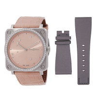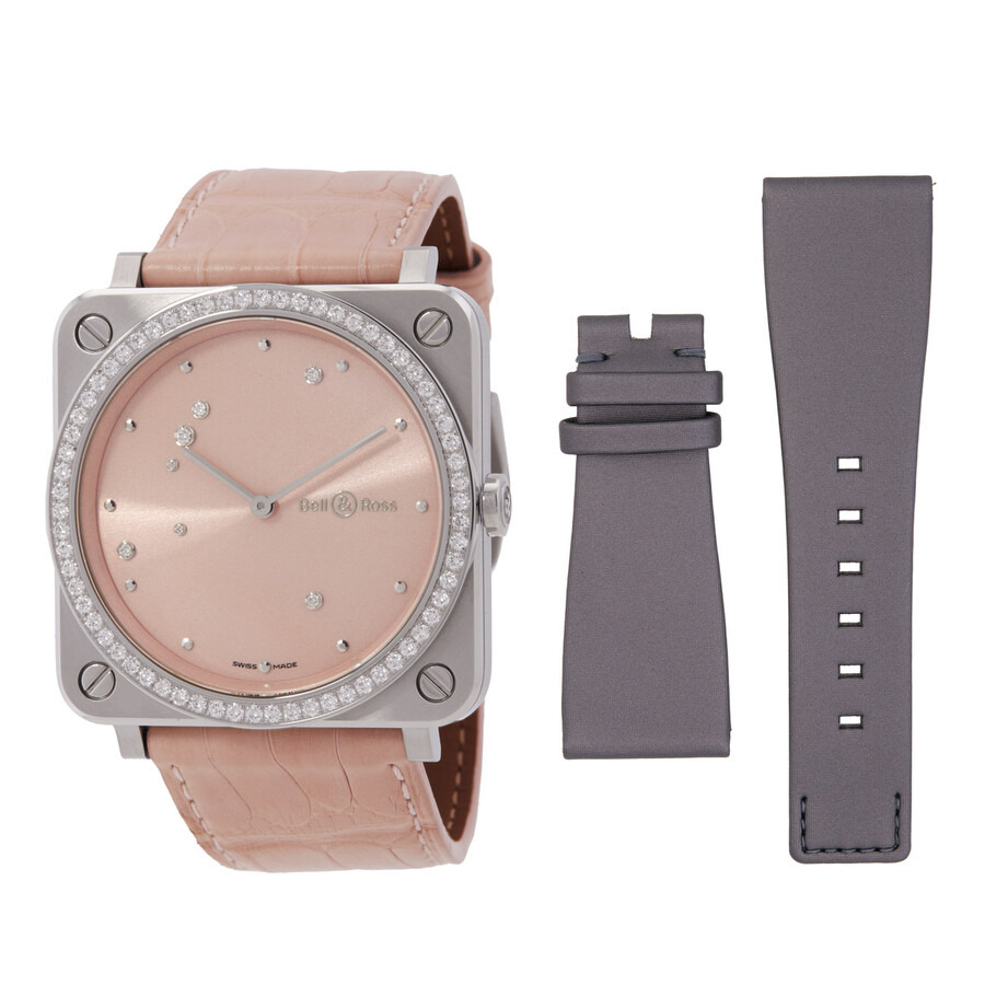 Silver-tone stainless steel case with a pink alligator leather strap. Fixed stainless steel bezel. Pink sunray dial with silver-tone hands. Dial Type: Analog. Bell and Ross Calibre BR-CAL.102 quartz movement. Scratch resistant sapphire crystal. Pull / push crown. Solid case back. Square case shape, case size: 39 mm x 39 mm. Buckle clasp. Water resistant at 100 meters / 330 feet. Functions: hour, minute. Additional Info: bezel set with 66 stones (0.99 ct). Luxury watch style. Watch label: Swiss Made. Bell and Ross Quartz Ladies Watch BRS-EP-ST-LGD/SCR. INFORMATION Brand: Bell And Ross Gender: Womens Model: BRS-EP-ST-LGD/SCR Watch Label: Swiss Made Movement: Quartz Engine: Bell and Ross Calibre BR-CAL.102 CASE Case Size: 39 mm x 39 mm Case Material: Stainless Steel Case Shape: Square Case Back: Solid BAND Band Material: Alligator Leather Band Type: Strap Band Color: Pink Clasp: Buckle DIAL Dial Color: Pink Sunray Type: Analog Crystal: Scratch Resistant Sapphire Hands: Silver-tone Bezel: Fixed Bezel Material: Stainless Steel Crown: Pull / Push FEATURES Water Resistance: 100 meters / 330 feet Functions: Hour, Minute Watch Features: Diamond, Stainless Steel, Leather, Analog, Alligator Leather ADDITIONAL INFO Watch Style: Luxury Warranty: 2 Year Jomashop Warranty Additional Info: bezel set with 66 stones (0.99 ct) Jomashop Sku: BLRBRS-EP-ST-LGD-SCR Department: Watches Category: Watches