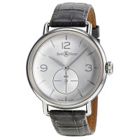Silver-tone stainless steel case with a grey crocodile leather strap. Fixed silver-tone stainless steel bezel. Silver dial with silver-tone hands and stick hour markers. Arabic numerals mark the 3, 9 and 12 o'clock positions. Dial Type: Analog. Luminescent hands and markers. Small seconds sub-dial at the 6 o'clock position subdials. Automatic movement with a 40-hour power reserve. Scratch resistant sapphire crystal. Screw down crown. Solid case back. Round case shape, case size: 41 mm. Tang clasp. Water resistant at 30 meters / 100 feet. Functions: hour, minute, second. Vintage Series. Luxury watch style. Watch label: Swiss Made. Bell and Ross WW1 Argentium Automatic Silver Dial Men's Watch BRWW1-ME-AG-S. GENERAL Box Type: Original Box Color: Grey / Silver CASE Case Size: 41 Case Material: Stainless Steel Case Shape: Round Case Back: Solid BAND Band Material: Crocodile Leather Band Type: Strap Band Color: Grey Clasp: Tang DIAL Dial Color: Silver Type: Analog Crystal: Scratch Resistant Sapphire Hands: Silver-tone Dial Markers: Stick Second Markers: Arabic numerals mark the 3, 9 and 12 o'clock positions Sub Dials: One - Small Second at the 6 o'clock position Luminiscence: Hands and Markers Bezel: Fixed Bezel Color: Silver-tone Bezel Material: Stainless Steel Crown: Screw Down INFORMATION Brand: Bell And Ross Series: Vintage Collection Name: Vintage Gender: Mens Model: BRWW1-ME-AG-SI/SC Watch Label: Swiss Made Movement: Automatic Power Reserve: 40 hours FEATURES Water Resistance: 30 meters / 100 feet Functions: Hour, Minute, Second Watch Features: Analog, Leather, Stainless Steel ADDITIONAL INFO Watch Style: Luxury Warranty: 2 Year Jomashop Warranty UPC Code: 845960039888 Jomashop Sku: BLRBRWW192-ARGENT Department: Watches Category: Watches
