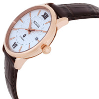 Rose gold-tone stainless steel case with a brown leather strap. Fixed rose gold-tone stainless steel bezel. Silver-tone dial with rose gold-tone hands and index-Roman numeral hour markers. Dial Type: Analog. Date display at the 3 o'clock position. Quartz movement. Scratch resistant sapphire crystal. Pull / push crown. Transparent see through case back. Round case shape, case size: 39 mm. Band width: 20 mm. 3pc wire strap buckle clasp. Water resistant at 30 meters / 100 feet. Functions: date, hour, minute, second. Hudson Series. Dress watch style. Watch label: Japan Movt. Bulova Hudson Quartz Silver-Tone Dial Men's Watch 97B225. GENERAL Box Type: Original Box CASE Case Size: 39 Case Material: Stainless Steel Case Shape: Round Case Back: Transparent See Through BAND Band Material: Leather Band Type: Strap Band Color: Brown Band Width: 20 mm Clasp: 3pc Wire Strap Buckle DIAL Dial Color: Silver-Tone Type: Analog Crystal: Scratch Resistant Sapphire Hands: Rose Gold-tone Dial Markers: Index-Roman Numeral Bezel: Fixed Bezel Color: Rose Gold-tone Bezel Material: Stainless Steel Crown: Pull / Push INFORMATION Brand: Bulova Series: Hudson Collection Name: Hudson Gender: Mens Model: 97B225 Watch Label: Japan Movt Movement: Quartz FEATURES Water Resistance: 30 meters / 100 feet Calendar: Date display at the 3 o'clock position Functions: Date, Hour, Minute, Second Watch Features: Analog, Gold, Leather, Stainless Steel ADDITIONAL INFO Watch Style: Dress Warranty: 2 Year Jomashop Warranty Jomashop Sku: BUL97B225 Department: Watches