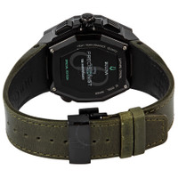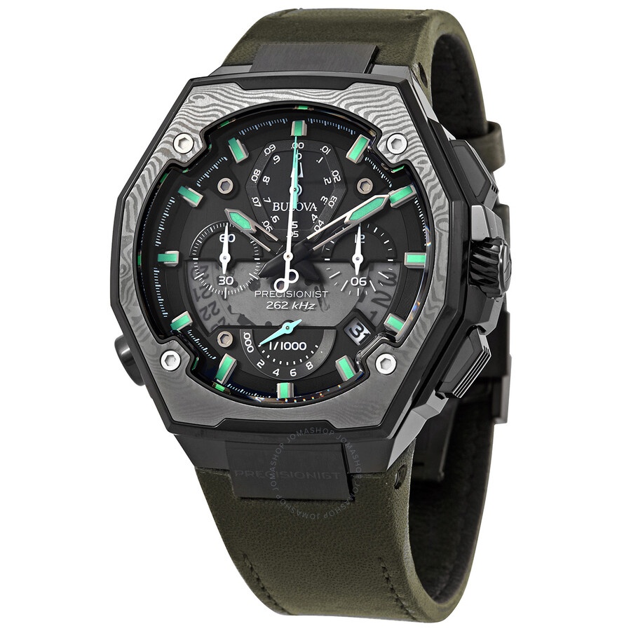Black-plated stainless steel case with a olive green leather strap. Fixed black-plated bezel. Black (cut-out) dial with luminous black hands and index hour markers. Minute markers around the outer rim. Dial Type: Analog. Luminescent hands and markers. Date display between the 4 and 5 o'clock positions. Quartz movement. Scratch resistant sapphire crystal. Solid case back. Octagon case shape. Case size: 44.5 mm. Case thickness: 17.55 mm. Deployment clasp. Water resistant at 50 meters / 165 feet. Functions: chronograph, date, hour, minute, second. Precisionist X Special Edition Series. Sport watch style. Bulova Precisionist X Special Edition Chronograph Quartz Black Dial Men's Watch 98B355. INFORMATION Brand: Bulova Series: Precisionist X Special Edition Collection Name: Precisionist X Special Edition Gender: Mens Model: 98B355 Movement: Quartz CASE Case Size: 44.5 mm Case Thickness: 17.55 mm Case Material: Stainless Steel Case Shape: Octagon Case Back: Solid BAND Band Material: Leather Band Type: Strap Band Color: Olive Green Clasp: Deployment DIAL Dial Color: Black (Cut-Out) Type: Analog Crystal: Scratch Resistant Sapphire Hands: Luminous Black Dial Markers: Index Second Markers: Minute Markers around the outer rim Luminiscence: Hands and Markers Bezel: Fixed Bezel Color: Black-plated Bezel Material: Stainless Steel FEATURES Water Resistance: 50 meters / 165 feet Calendar: Date display between the 4 and 5 o'clock positions Functions: Chronograph, Date, Hour, Minute, Second Watch Features: Chronograph, Stainless Steel, Leather, Analog ADDITIONAL INFO Watch Style: Sport Warranty: 2 Year Jomashop Warranty UPC Code: 042429585560 Jomashop Sku: BUL98B355 Department: Watches Category: Watches