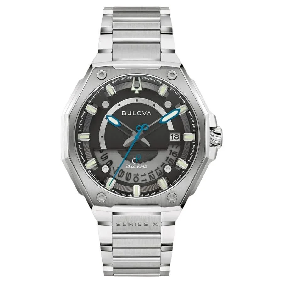 Silver-tone stainless steel case and bracelet. Fixed silver-tone stainless steel bezel. Black dial with blue hands and index hour markers. Minute markers around the outer rim. Dial Type: Analog. Luminescent hands and markers. Date display at the 3 o'clock position. Quartz movement. Scratch resistant sapphire crystal. Pull / push crown. Round case shape, case size: 42 mm, case thickness: 14 mm. Band width: 23 mm, band length: 7.5 inches. Fold over clasp. Water resistant at 100 meters / 330 feet. Functions: date, hour, minute, second. Series X Series. Fashion watch style. Bulova Series X Quartz Black Dial Men's Watch 98B456. GENERAL Box Type: Original Box CASE Case Diameter: 42 mm Case Thickness: 14 mm Case Material: Stainless Steel Case Shape: Round BAND Band Material: Stainless Steel Band Type: Bracelet Band Color: Silver-tone Band Length: 7.5 inches Band Width: 23 mm Clasp: Fold Over DIAL Dial Color: Black Type: Analog Crystal: Scratch Resistant Sapphire Hands: Blue Dial Markers: Index Second Markers: Minute Markers around the outer rim Luminiscence: Hands and Markers Bezel: Fixed Bezel Color: Silver-tone Bezel Material: Stainless Steel Crown: Pull / Push INFORMATION Brand: Bulova Series: Series X Collection Name: Series X Gender: Mens Model: 98B456 Movement: Quartz FEATURES Water Resistance: 100 meters / 330 feet Calendar: Date display at the 3 o'clock position Functions: Date, Hour, Minute, Second Watch Features: Stainless Steel, Analog ADDITIONAL INFO Watch Style: Fashion Warranty: 2 Year Jomashop Warranty UPC Code: 042429605282 Jomashop Sku: BUL98B456 Department: Watches
