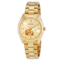 Gold-tone stainless steel case and bracelet. Fixed gold-tone stainless steel bezel. Champagne dial with gold-tone hands and index hour markers. Minute scale around the inner rim. Dial Type: Analog. Luminescent hands. Bulova Calibre 82S0 automatic movement with a 42-hour power reserve. Scratch resistant sapphire crystal. Transparent see through case back. Round case shape, case size: 39 mm. Band width: 20 mm. Deployment with push button release clasp. Water resistant at 30 meters / 100 feet. Functions: hour, minute, second. Surveyor Series. Sport watch style. Bulova Surveyor Automatic Champagne Dial Men's Watch 97A182. GENERAL Box Type: Original Box CASE Case Size: 39 Case Material: Stainless Steel Case Shape: Round Case Back: Transparent See Through BAND Band Material: Stainless Steel Band Type: Bracelet Band Color: Gold-tone Band Width: 20 mm Clasp: Deployment with Push Button Release DIAL Dial Color: Champagne Type: Analog Crystal: Scratch Resistant Sapphire Hands: Gold-tone Dial Markers: Index Second Markers: Minute Scale around the inner rim Luminiscence: Hands Bezel: Fixed Bezel Color: Gold-tone Bezel Material: Stainless Steel INFORMATION Brand: Bulova Series: Surveyor Collection Name: Surveyor Gender: Mens Model: 97A182 Movement: Automatic Engine: Bulova Calibre 82S0 Power Reserve: 42 hours FEATURES Water Resistance: 30 meters / 100 feet Functions: Hour, Minute, Second Watch Features: Analog, Gold, Stainless Steel ADDITIONAL INFO Watch Style: Sport Warranty: 2 Year Jomashop Warranty Jomashop Sku: BUL97A182 Department: Watches