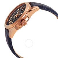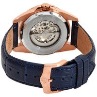 Rose gold-tone stainless steel case with a blue (alligator) leather strap. Fixed rose gold-tone bezel. Blue and silver (skeleton center) dial with luminous rose gold-tone hands and alternating Roman numeral and index hour markers. Minute markers around the outer rim. Dial Type: Analog. Luminescent hands and markers. Miyota Caliber 8N24 Automatic movement, containing 21 Jewels, bitting at 21600 vph, and has a power reserve of approximately 42 hours. Scratch resistant mineral crystal. Transparent case back. Round case shape. Case size: 43 mm. Case thickness: 12.2 mm. Band width: 21 mm. Tang clasp. Water resistant at 100 meters / 330 feet. Functions: hour, minute, second. Sutton Series. Casual watch style. Bulova Sutton Automatic Silver Skeleton Dial Men's Watch 97A161. GENERAL Box Type: Original Box CASE Case Size: 43 Case Thickness: 12.2 mm Case Material: Stainless Steel Case Shape: Round Case Back: Transparent BAND Band Material: (Alligator) Leather Band Type: Strap Band Color: Blue Band Width: 21 mm Clasp: Tang DIAL Dial Color: Blue and Silver (Skeleton Center) Type: Analog Crystal: Scratch Resistant Mineral Hands: Luminous Rose Gold-tone Dial Markers: Alternating Roman Numeral and Index Second Markers: Minute Markers around the outer rim Luminiscence: Hands and Markers Bezel: Fixed Bezel Color: Rose Gold-tone Bezel Material: Stainless Steel INFORMATION Brand: Bulova Series: Sutton Collection Name: Sutton Gender: Mens Model: 97A161 Movement: Automatic Engine: Miyota Caliber 8N24 FEATURES Water Resistance: 100 meters / 330 feet Functions: Hour, Minute, Second Watch Features: Alligator Leather, Analog, Gold, Leather, Stainless Steel ADDITIONAL INFO Watch Style: Casual Warranty: 2 Year Jomashop Warranty UPC Code: 042429585485 Jomashop Sku: BUL97A161 Department: Watches Category: Watches