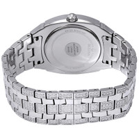 Stainless steel case with a stainless steel bracelet with crystal pave links. Fixed stainless steel bezel set with crystal pavel. Crystal pave dial with luminous silver-tone hands and index hour markers. Dial Type: Analog. Luminescent hands. Date display at the 6 o'clock position. Quartz movement. Scratch resistant mineral crystal. Pull / push crown. Solid case back. Cushion case shape. Case size: 40 mm. Case thickness: 11.1 mm. Band width: 20 mm. Band length: 7 inches. Fold over clasp. Water resistant at 30 meters / 100 feet. Functions: date, hour, minute, second. Additional Info: watch set with 582 swarovski crystals. Dress watch style. Bulova Swarovski Crystal Pave Men's Watch 96B296. GENERAL Box Type: Original Box CASE Case Size: 40 Case Thickness: 11.1 mm Case Material: Stainless Steel Case Shape: Cushion Case Back: Solid BAND Band Material: Stainless Steel with Crystal Pave Links Band Type: Bracelet Band Color: Silver-tone Band Length: 7 inches Band Width: 20 mm Clasp: Fold Over DIAL Dial Color: Crystal Pave Type: Analog Crystal: Scratch Resistant Mineral Hands: Luminous Silver-tone Dial Markers: Index Luminiscence: Hands Bezel: Fixed Bezel Color: Silver-tone Bezel Material: Stainless Steel set With Crystal Pave Crown: Pull / Push INFORMATION Brand: Bulova Series: Crystal Collection Name: Crystal Gender: Mens Model: 96B296 Watch Label: Japan Movt Movement: Quartz FEATURES Water Resistance: 30 meters / 100 feet Calendar: Date display at the 6 o'clock position Functions: Date, Hour, Minute, Second Watch Features: Stainless Steel, Analog ADDITIONAL INFO Watch Style: Dress Warranty: 2 Year Jomashop Warranty UPC Code: 042429560833 Additional Info: watch set with 582 Swarovski crystals Jomashop Sku: BUL96B296 Department: Watches Category: Watches