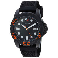 Black-plated stainless steel case with a black rubber strap. Uni-directional rotating black-plated bezel. Black dial with luminous silver-tone hands and dot hour markers. Minute markers around the outer rim. Dial Type: Analog. Luminescent hands and markers. Date display at the 3 o'clock position. Quartz movement. Scratch resistant mineral crystal. Solid case back. Round case shape. Case size: 42 mm. Case thickness: 12.5 mm. Band width: 21 mm. Band length: 8.5 inches. Tang clasp. Water resistant at 50 meters / 165 feet. Functions: date, hour, minute, second. Akron Series. Sport watch style. Calibre Akron Black Dial Men's SC-4A1-13-007.79. CASE Case Size: 42 Case Thickness: 12.5 mm Case Material: Stainless Steel Case Shape: Round Case Back: Solid BAND Band Material: Rubber Band Type: Strap Band Color: Black Band Length: 8.5 inches Band Width: 21 mm Clasp: Tang DIAL Dial Color: Black Type: Analog Crystal: Scratch Resistant Mineral Hands: Luminous Silver-tone Dial Markers: Dot Luminiscence: Hands and Markers Bezel: Uni-directional Rotating Bezel Color: Black-plated Bezel Material: Stainless Steel INFORMATION Brand: Calibre Series: Akron Collection Name: Akron Gender: Mens Model: SC-4A1-13-007.79 Movement: Quartz FEATURES Water Resistance: 50 Meters / 165 feet Calendar: Date display at the 3 o'clock position Functions: Date, Hour, Minute, Second Watch Features: Stainless Steel, Rubber, Analog ADDITIONAL INFO Watch Style: Sport Warranty: With Manufacturers Guarantee UPC Code: 840840100528 Jomashop Sku: Z-F9PFZ Department: Watches
